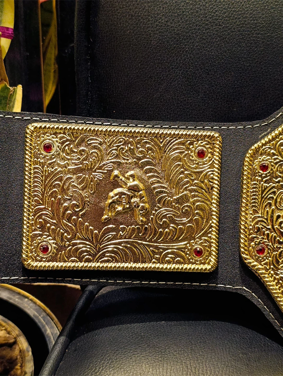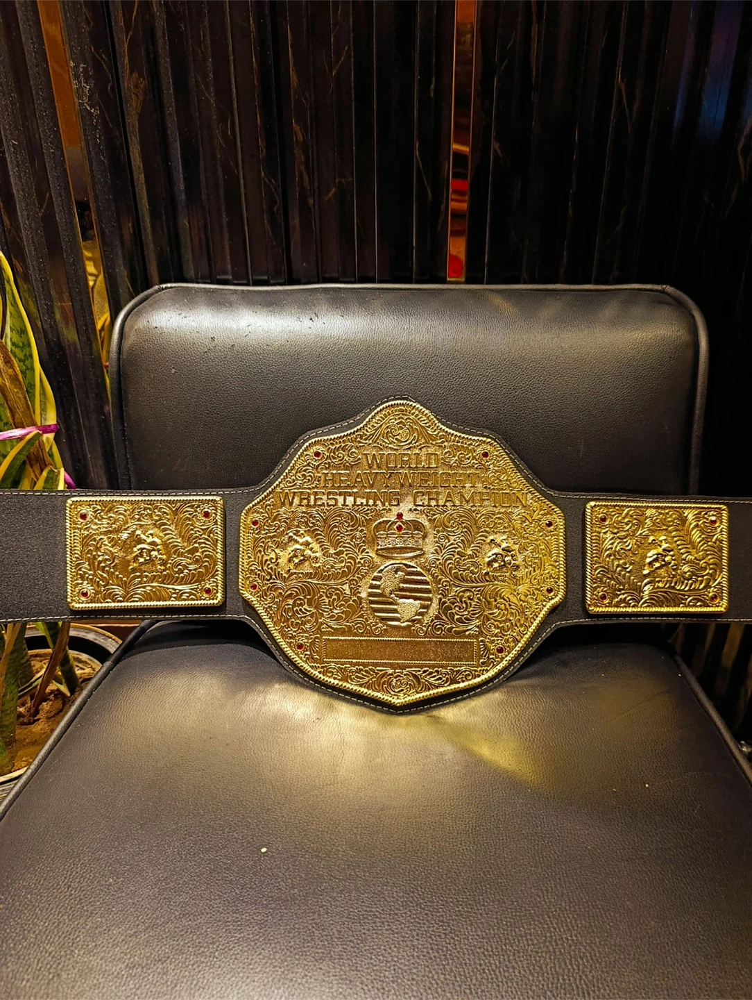 Selling a World Heavyweight Wrestling Championship belt. It's a beautiful piece with intricate gold detailing and red accents. A great item for any wrestling fan or collector!