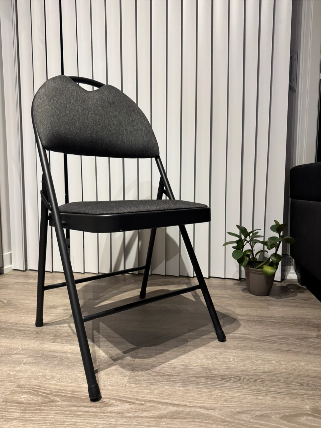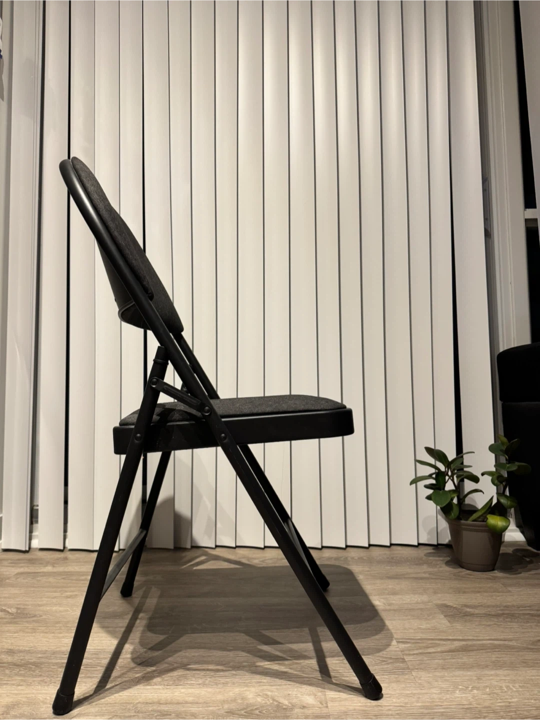 Comfortable black folding chair with good padding on the seat and headrest.