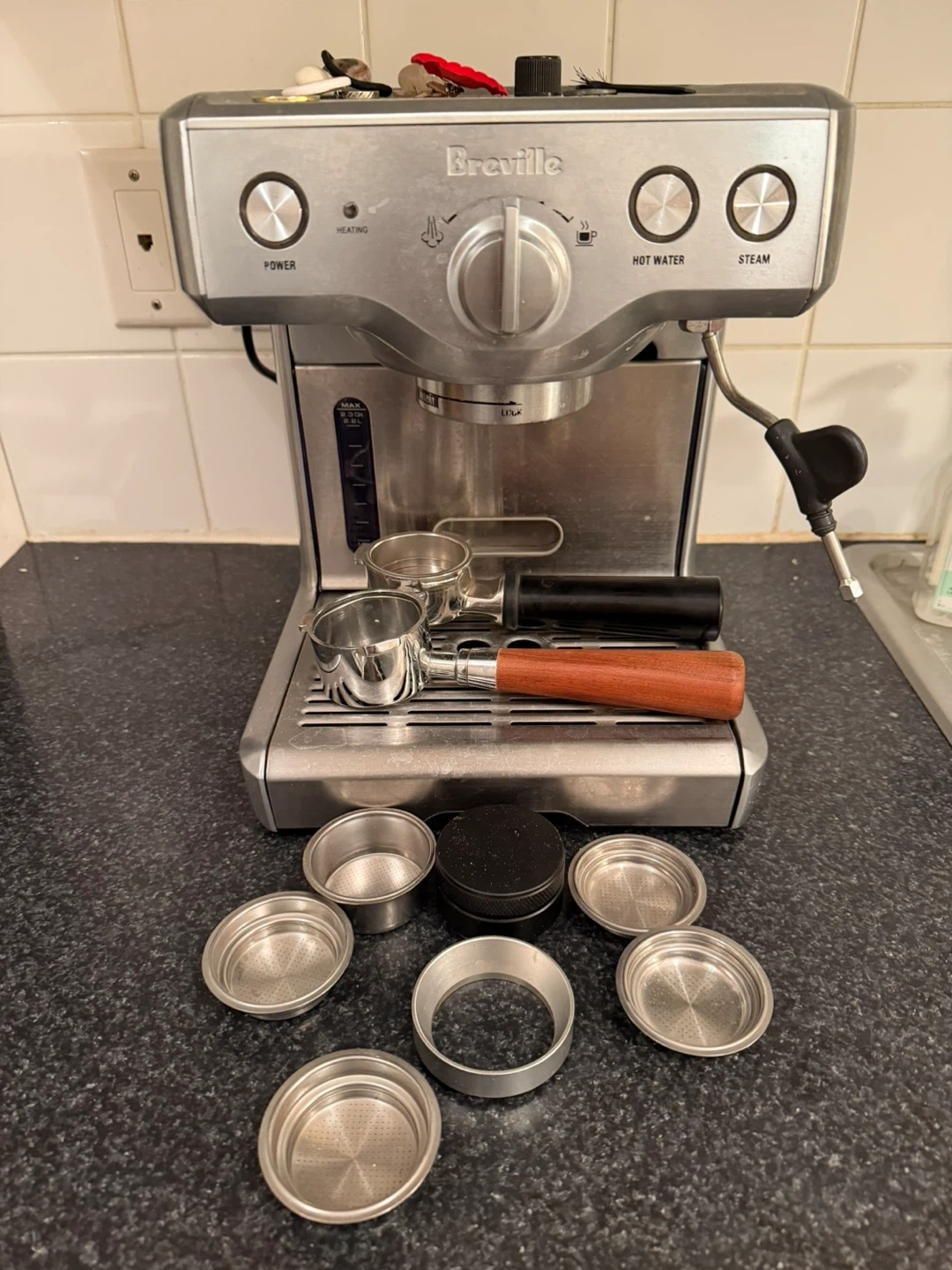 Selling a Breville espresso machine with all the accessories in the photo, includes a portafilter, tamper, and multiple filter baskets. We’ve had this machine for over 5 years.