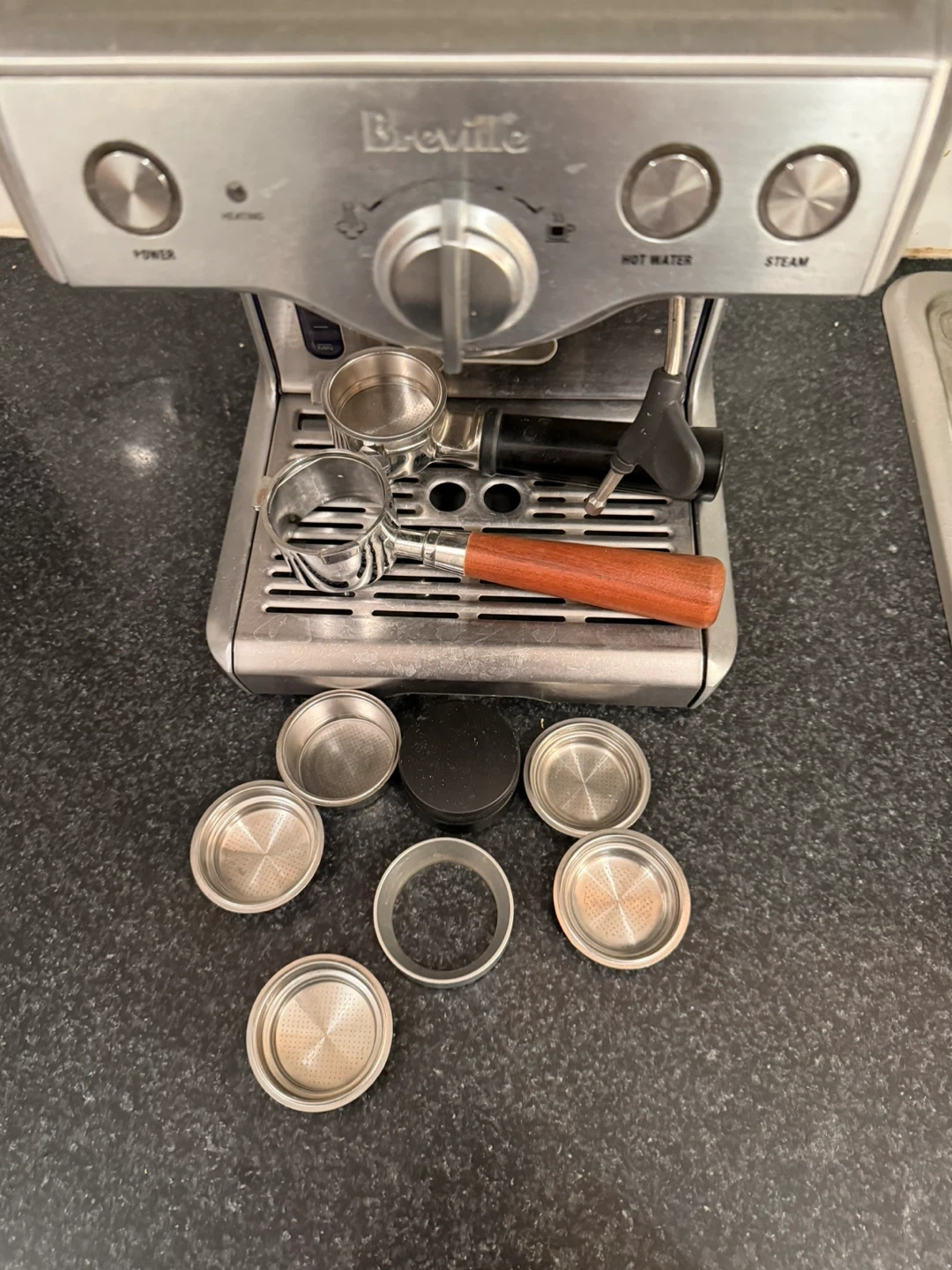 Selling a Breville espresso machine with all the accessories in the photo, includes a portafilter, tamper, and multiple filter baskets. We’ve had this machine for over 5 years.
