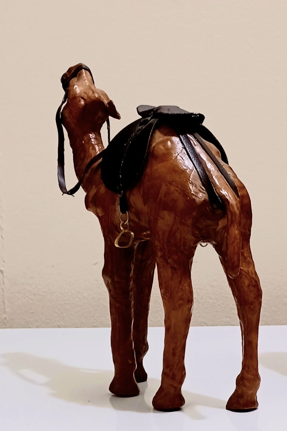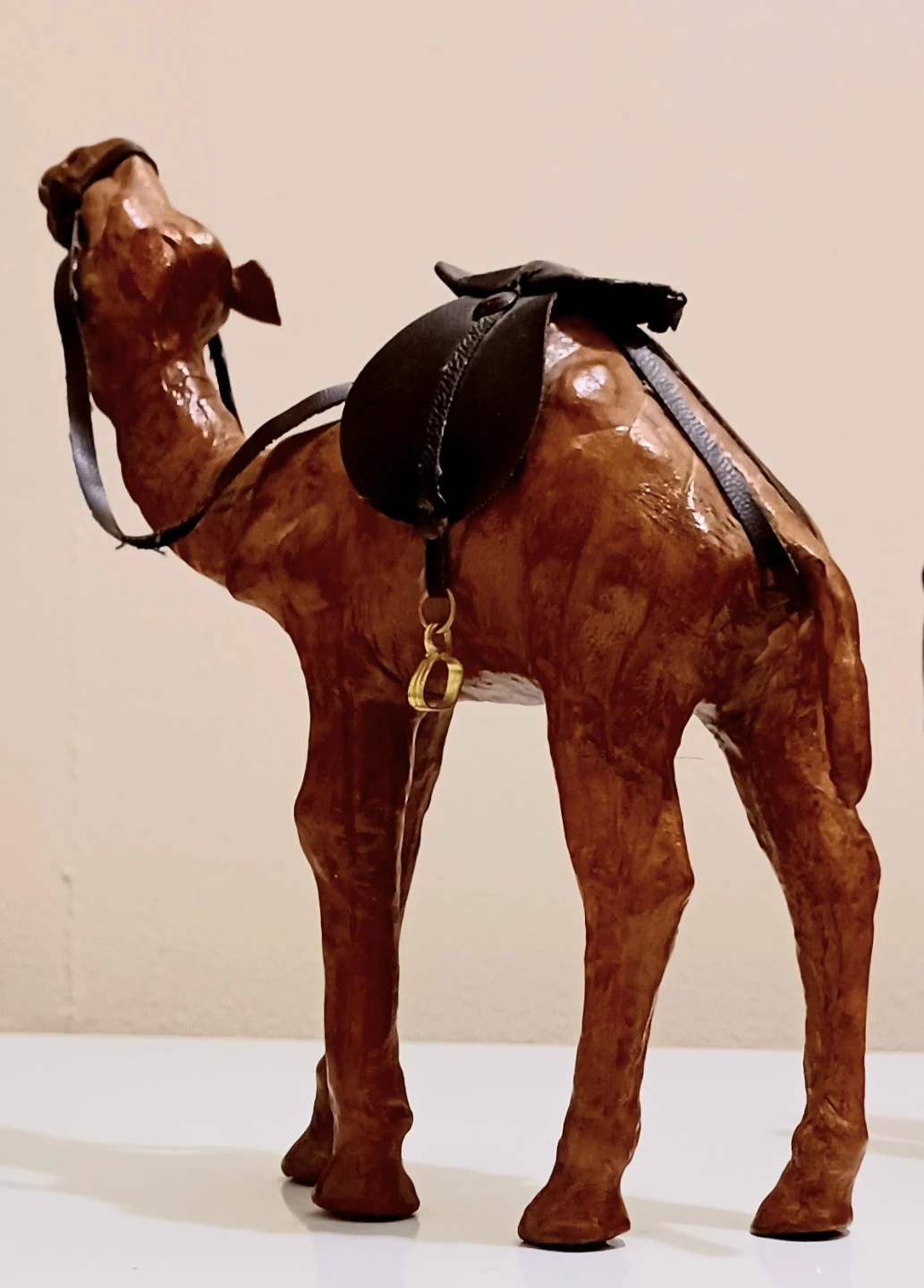 Add a touch of desert charm to your home with this vintage Mid-Century Folk Art Detailed Hand Crafted Camel Figurine, Complete with a Saddle and Bridle!