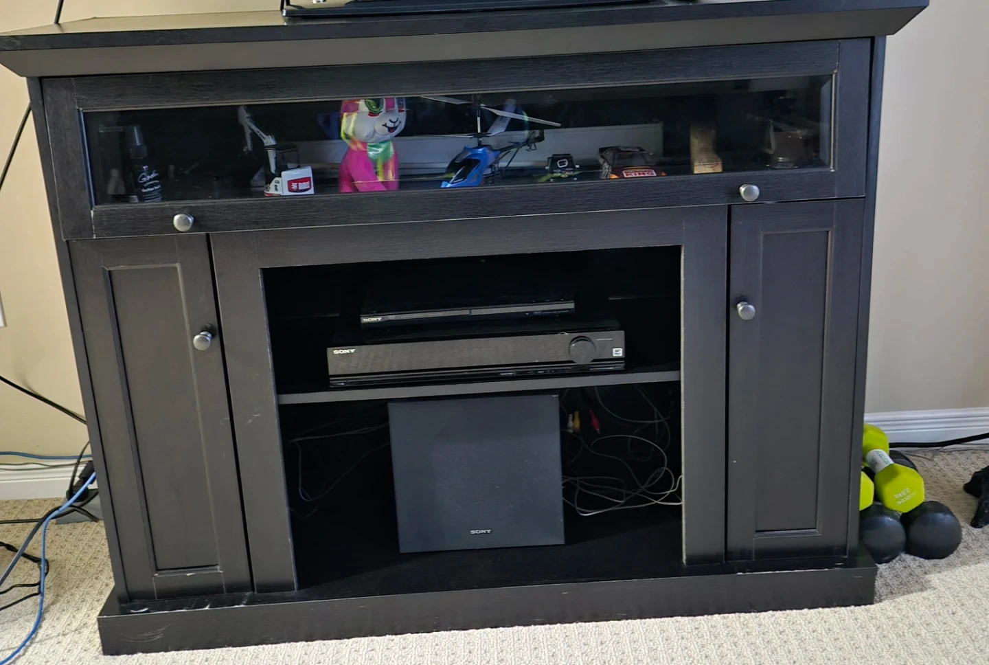 Black entertainment stand with glass-fronted cabinets and open shelving. It features ample space for media consoles and storage. Perfect for organizing your living room setup!