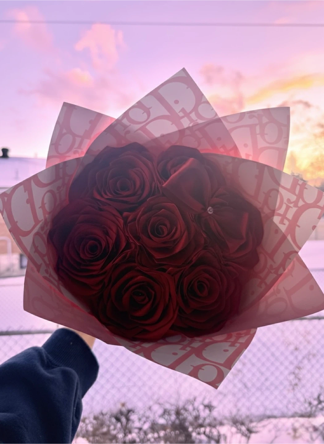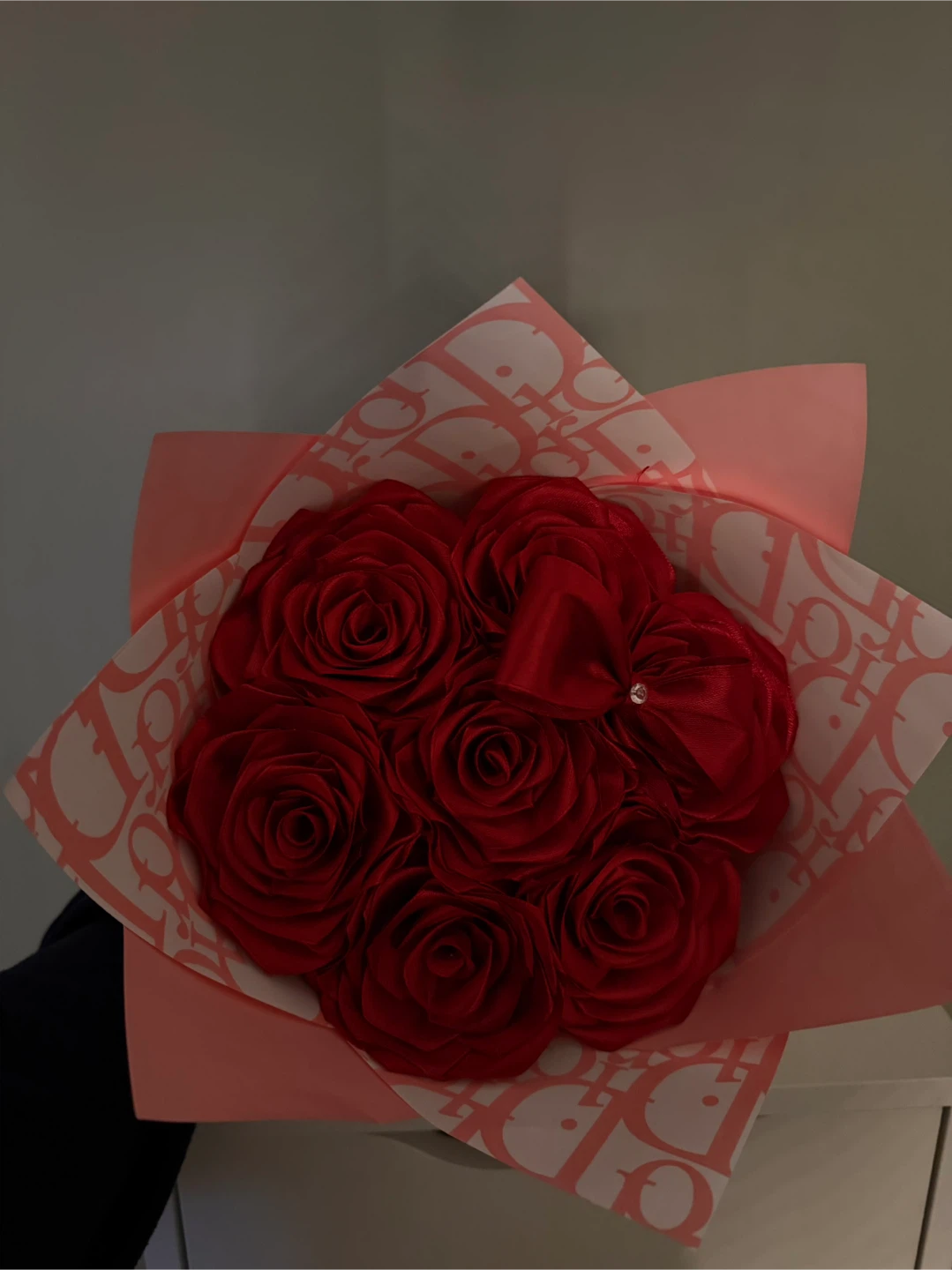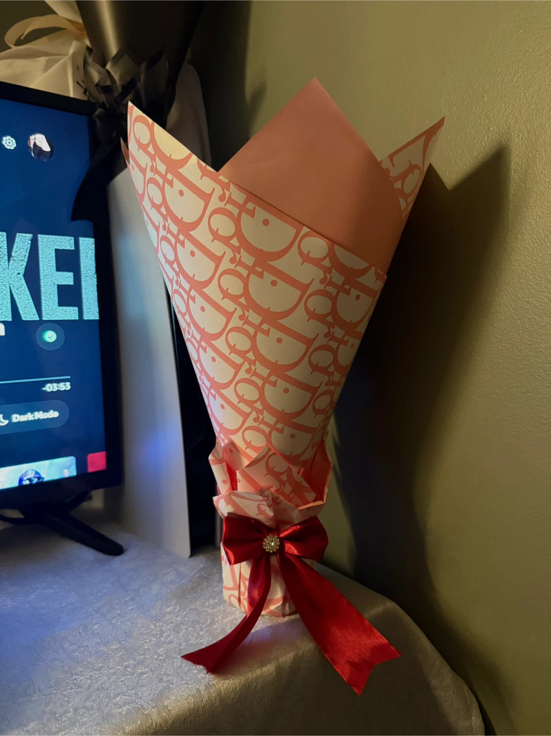 A bouquet of red roses. It's wrapped in distinctive pink Dior-patterned paper. A red ribbon with a sparkling accent is tied around the stem.