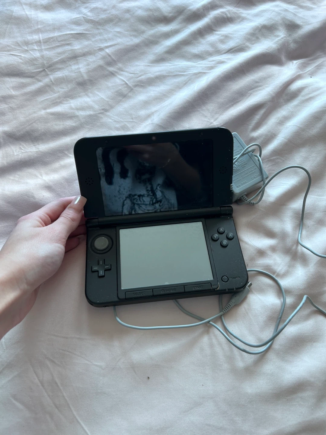 This is a blue Nintendo 3DS XL. It includes the AC adapter for charging. It's a classic handheld gaming device.