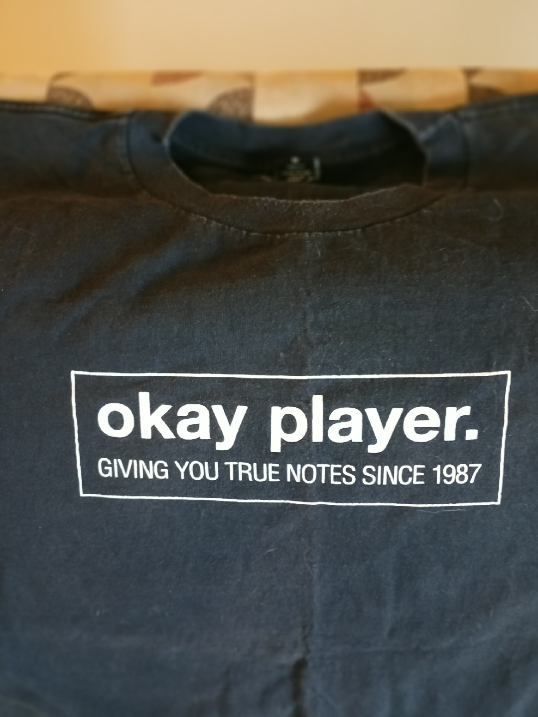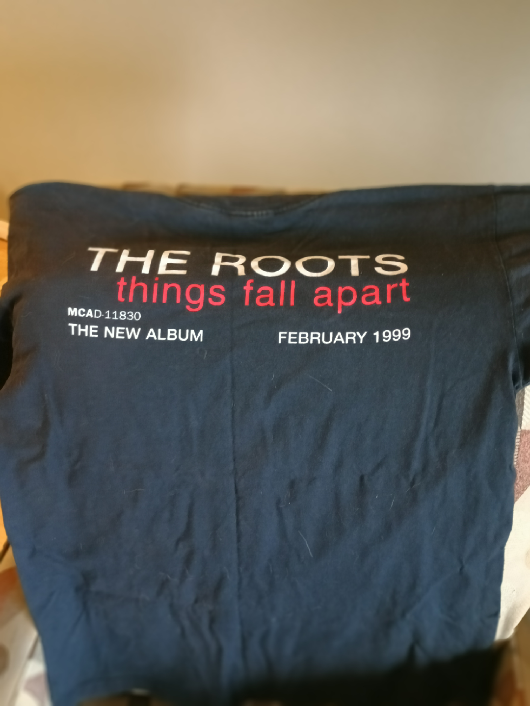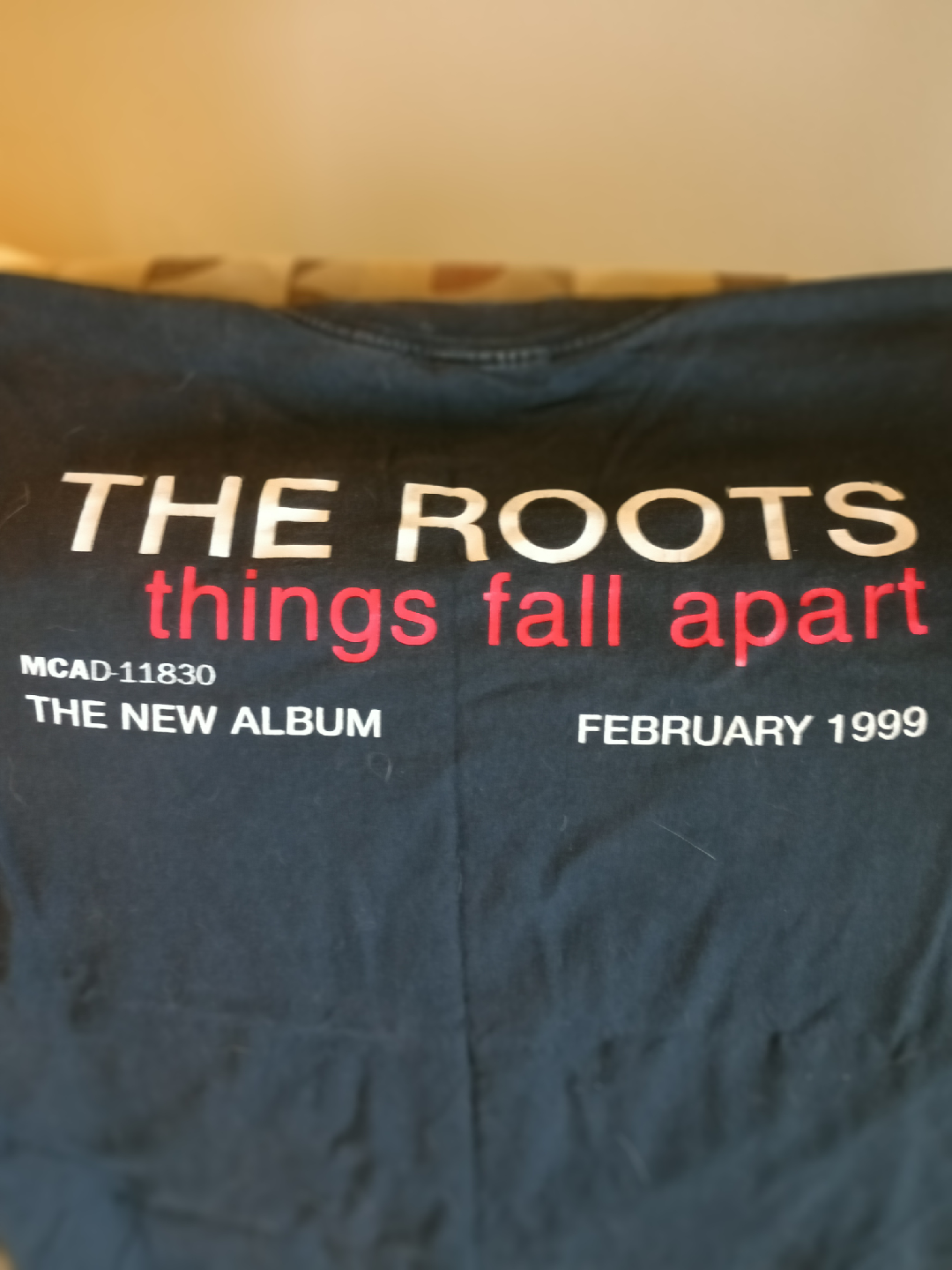 Selling a black T-shirt featuring "The Roots things fall apart" album art from February 1999. The shirt also has "okay player. GIVING YOU TRUE NOTES SINCE 1987" on the front