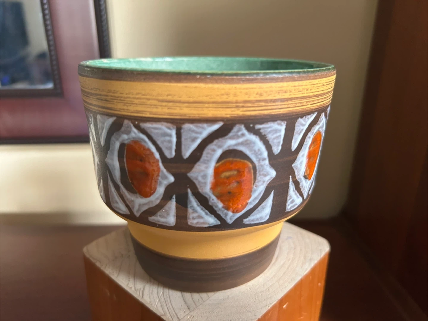 $22 orange Vintage Mid Century Modern Pottery Planter- BPF Heffen Belgium West German MCM antique $22 Flexible re days time for pickup Elmsdale Road Donlands O'Connor East York M4J 3m3 Don Mills south exit off DVP Wonderful Vintage Mid Century Modern MCM Planter Flower Pots succulent vase catch all Not quite far lava but nice pops or Orange red and hand decorated Made by BPF Heffen - Belgium Diameter: 5" Height: 4.25 inch hand decorated Very Good Vintage Used Condition but there's some wear / small blemish on inside rim - very minor Heavy Duty, Textured, Well Made Pottery Great MCM Design