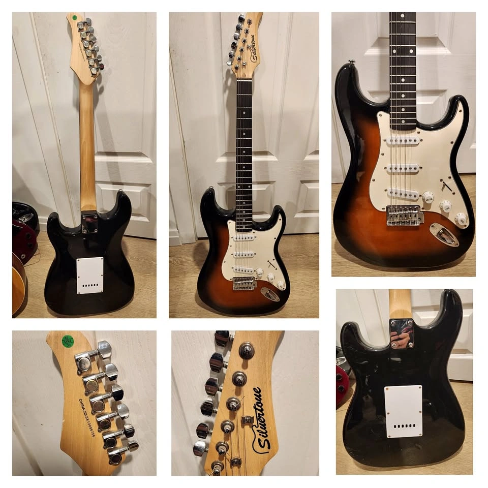 121Silvertone Stratocaster style electric guitar in sunburst finish with a rosewood fretboard. It has a maple neck, rosewood fretboard, 3-ply pickguard, 3 single-coil pickups, 5-way switch, vol/tone/tone controls and a tremolo bridge. All of my guitars have warranty from me for one year from the date of purchase. I have 200+ guitars and basses available. Take a look: https://www.guitar-toronto.com/guitars-bass-for-sale I am located at Kennedy and Ellesmere, Toronto. Postal code is M1P2A1. https://maps.app.goo.gl/dwCz68d9ETqSTQuo6 I also work in King City on regular school days if you prefer to pick up from there.