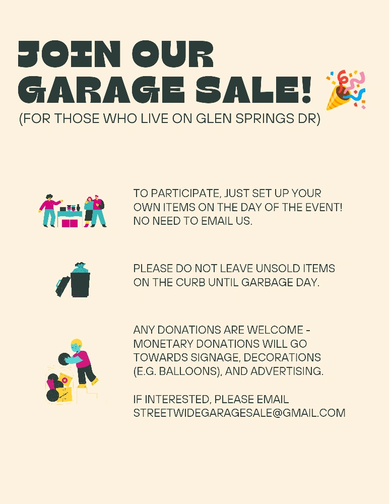 Don't miss the Street-Wide Garage Sale happening on Sunday, June 9th, 2024, from 8:30 AM to 4:30 PM! Multiple houses along Glen Springs Drive are participating, offering a fantastic range of items at fantastic prices.