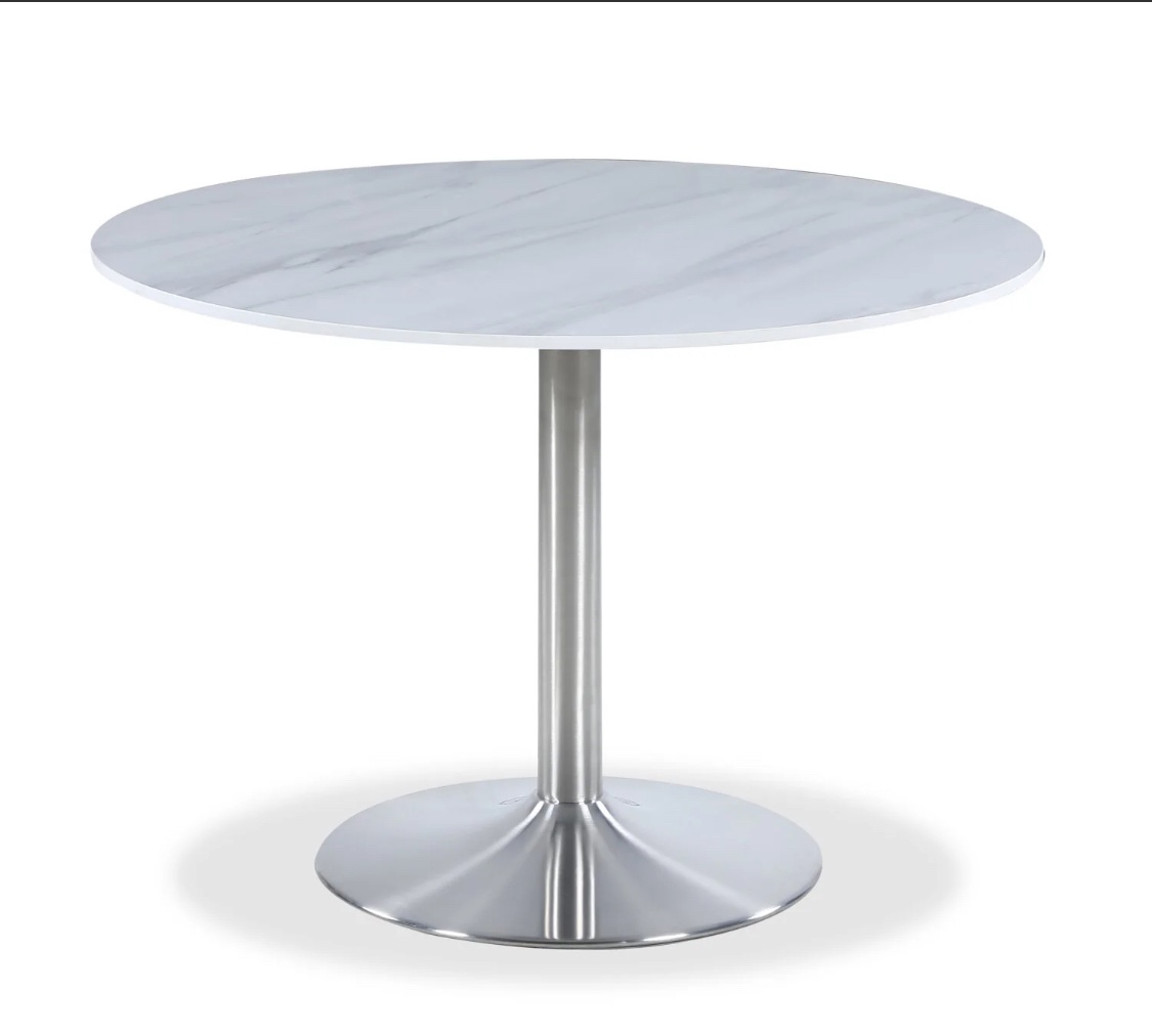 This Tera dining table is ideal for smaller spaces, but its round shape provides ample room for guests and your culinary delights. The white cultured marble tabletop, combined with the streamlined stainless steel base.