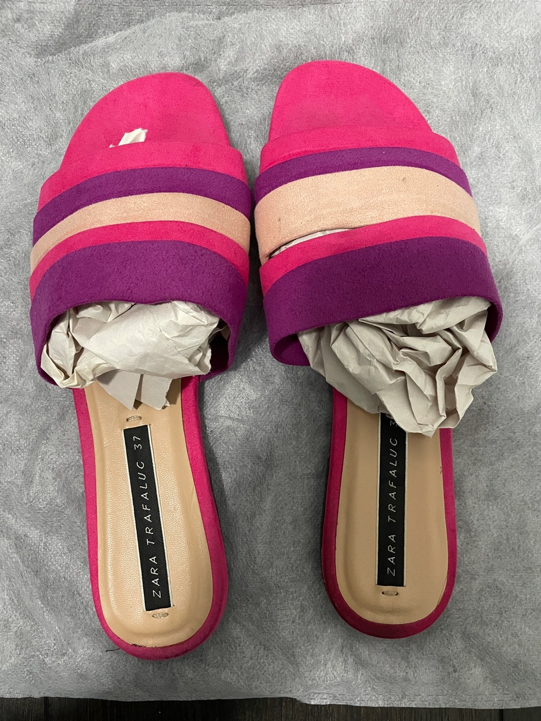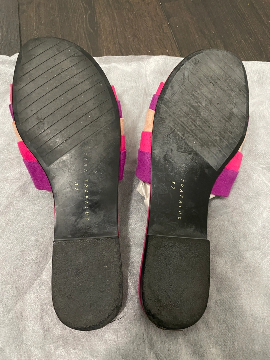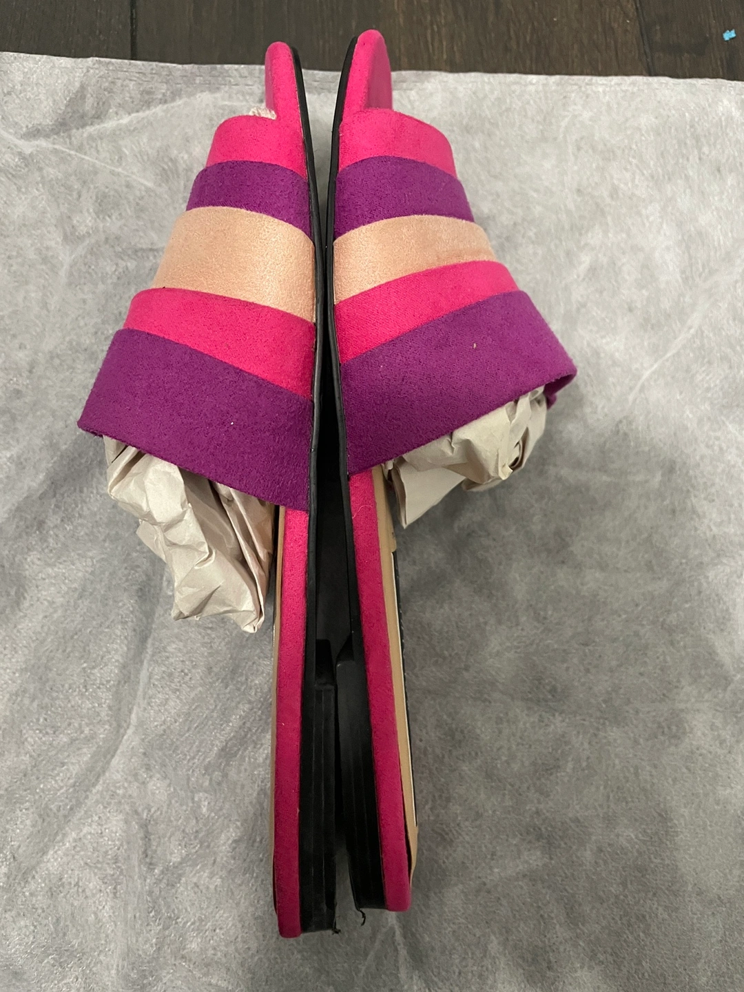 Suede effect material in pink purple and cream. Used a few times so there is some wear at the bottom. Runs small, but I have a high instep. Feel free to reach out if there are any questions.