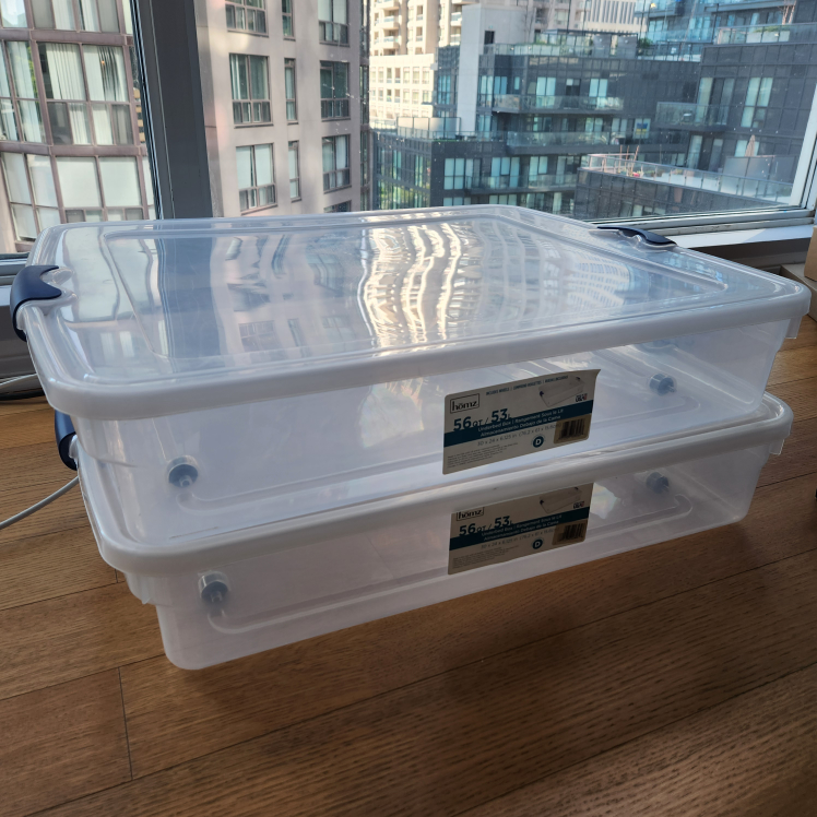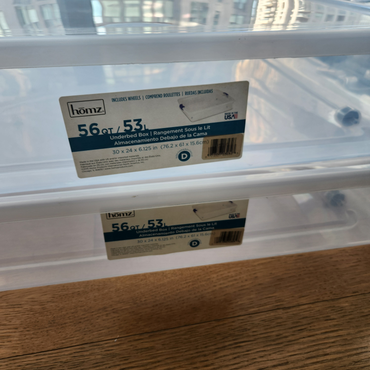 Retail price: 118.27 CAD before tax at Amazon Link: Homz Plastic Underbed Storage, Stackable Storage Bins with Blue Latching Handles, 56 Quart, Clear, 2-Pack https://a.co/d/2mRCIdJ Condition: Good condition Reason to sell: Move out of Canada **Only available for pick up**