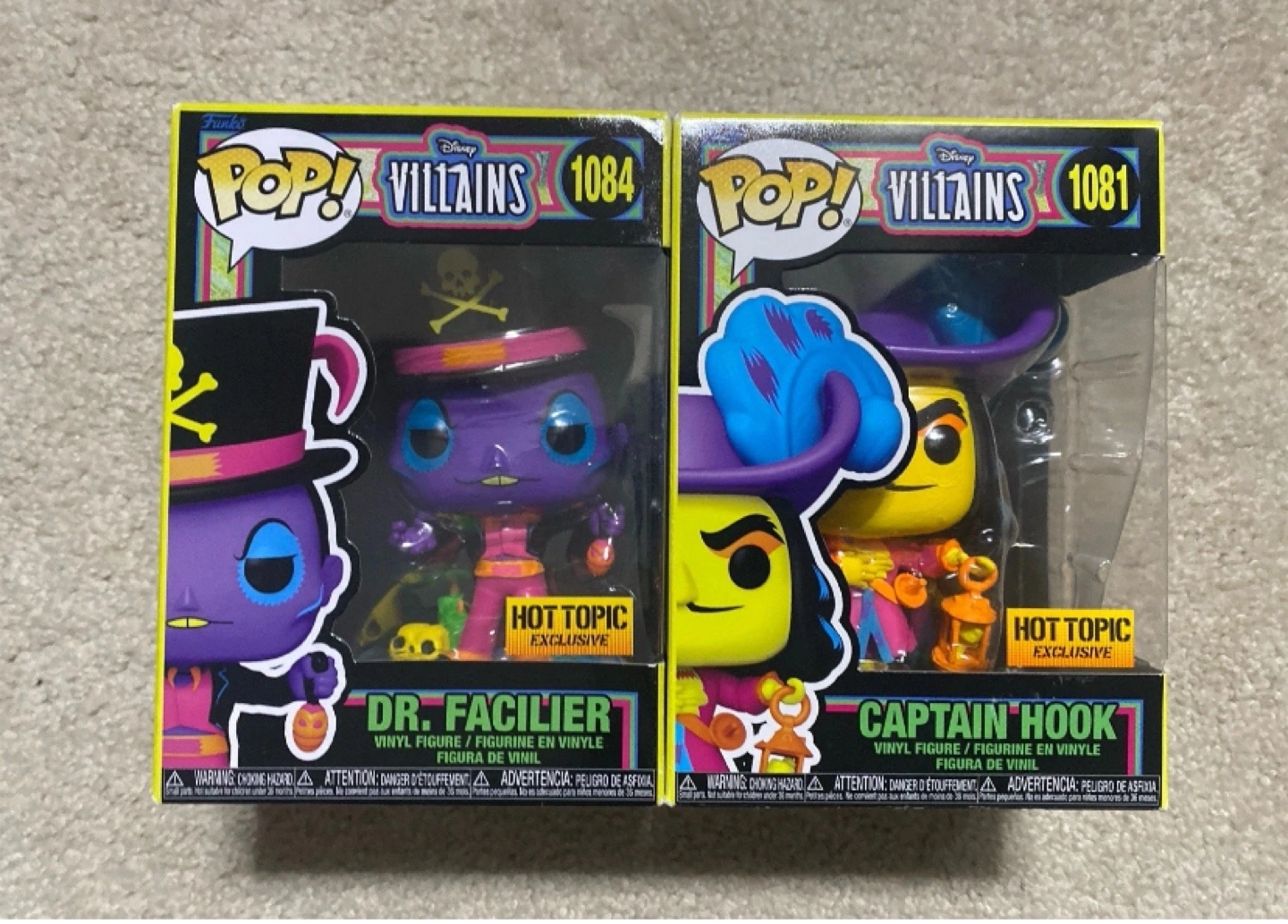 Selling two Funko Pop! figures from the Disney Villains series. You'll get Dr. Facilier (1084) and Captain Hook (1081). Both are Hot Topic exclusives and come in their original boxes. They're in great condition and ready for a new home!