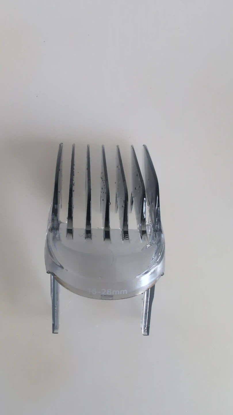 This is a hair clipper comb attachment. It's a transparent plastic piece. The size range is 16-28mm. It's useful for achieving different hair lengths.