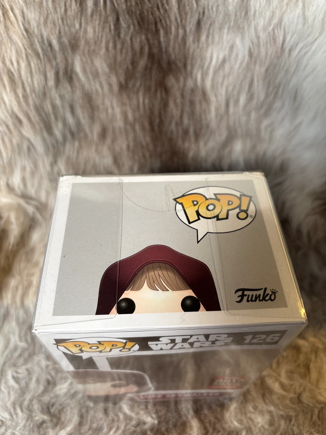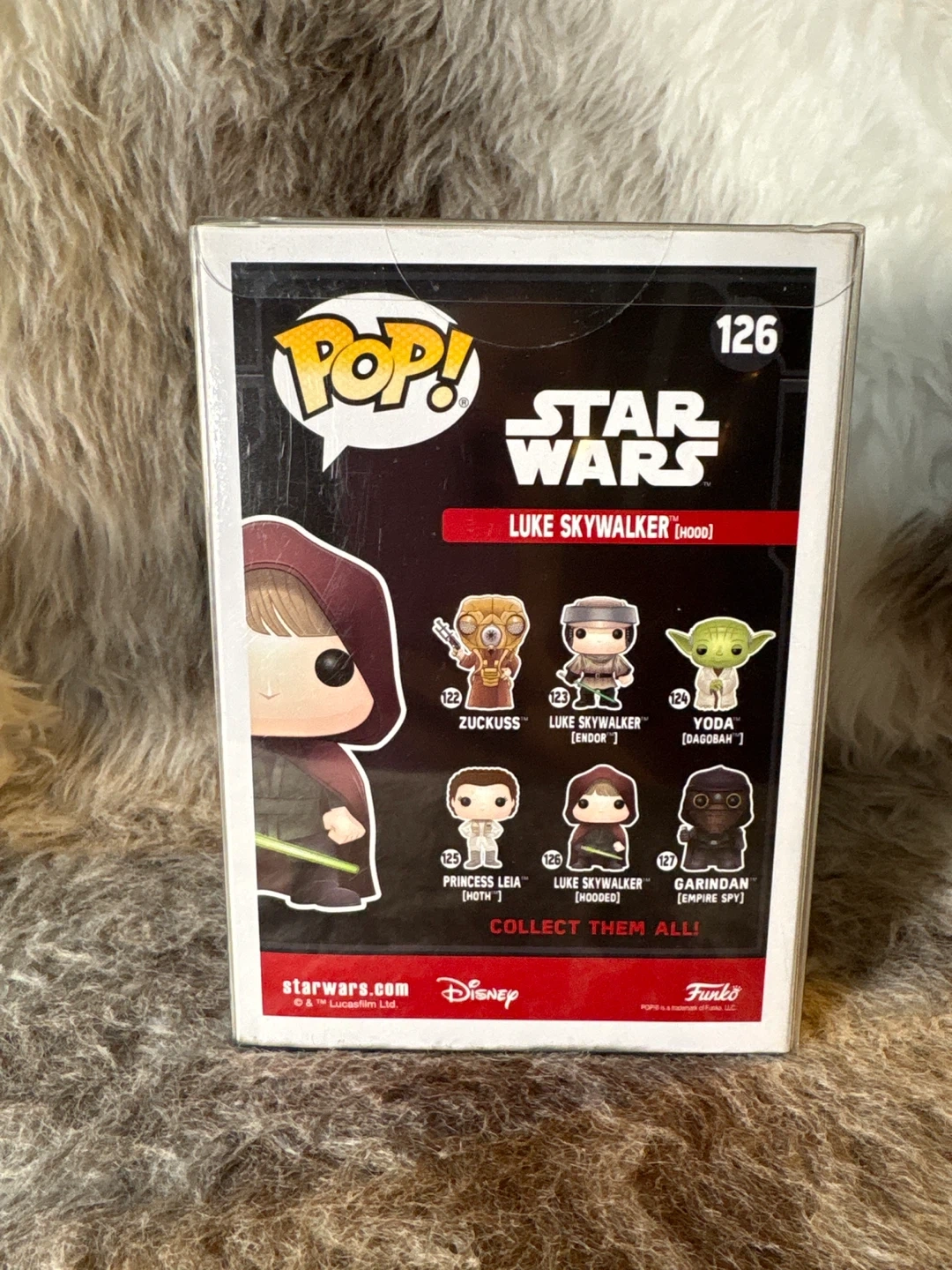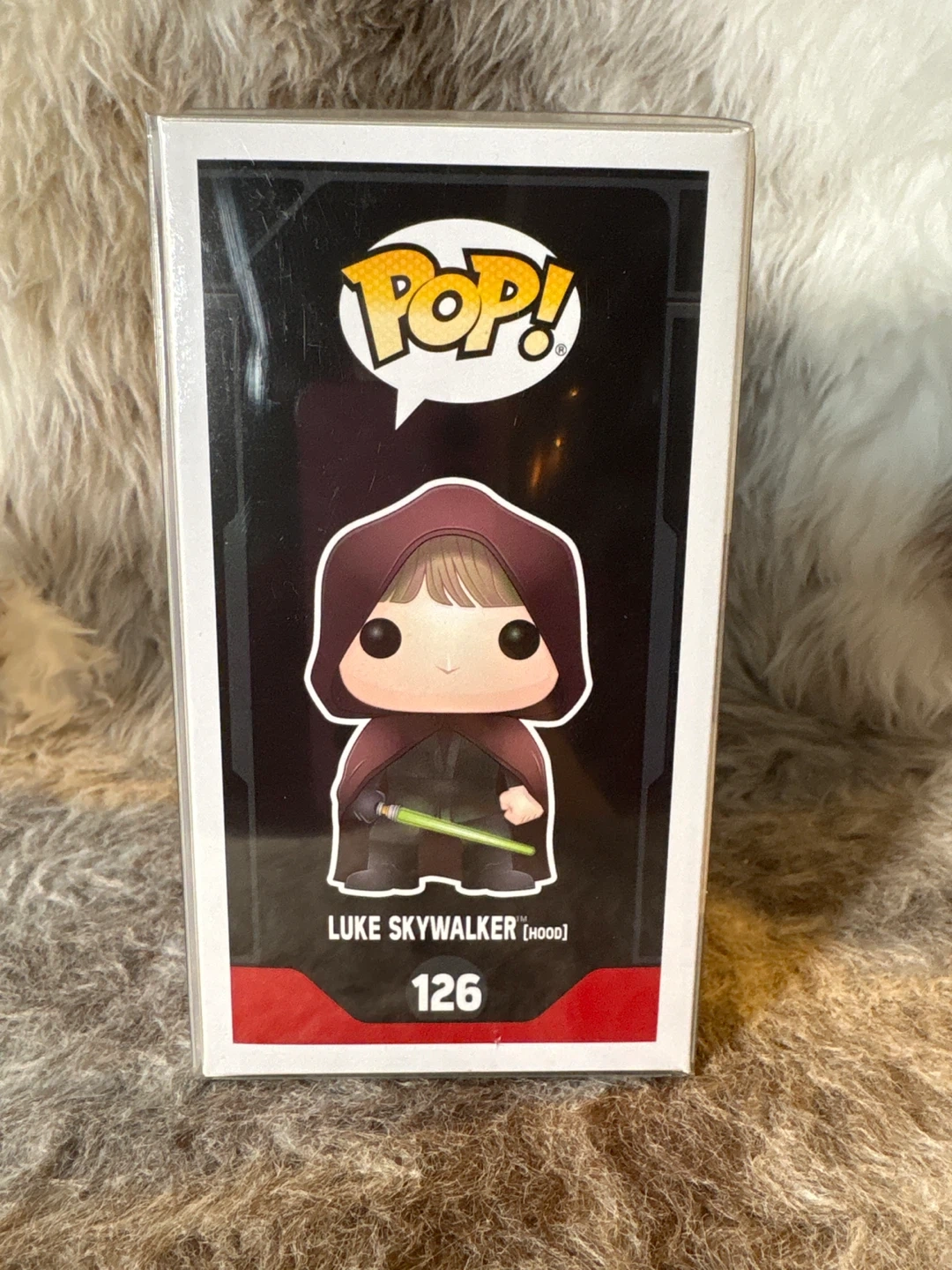 This is a Funko Pop! vinyl bobble-head of Luke Skywalker in his hood, number 126. This is a 2017 Galactic Convention Exclusive figure. In its original box with a protective sleeve.