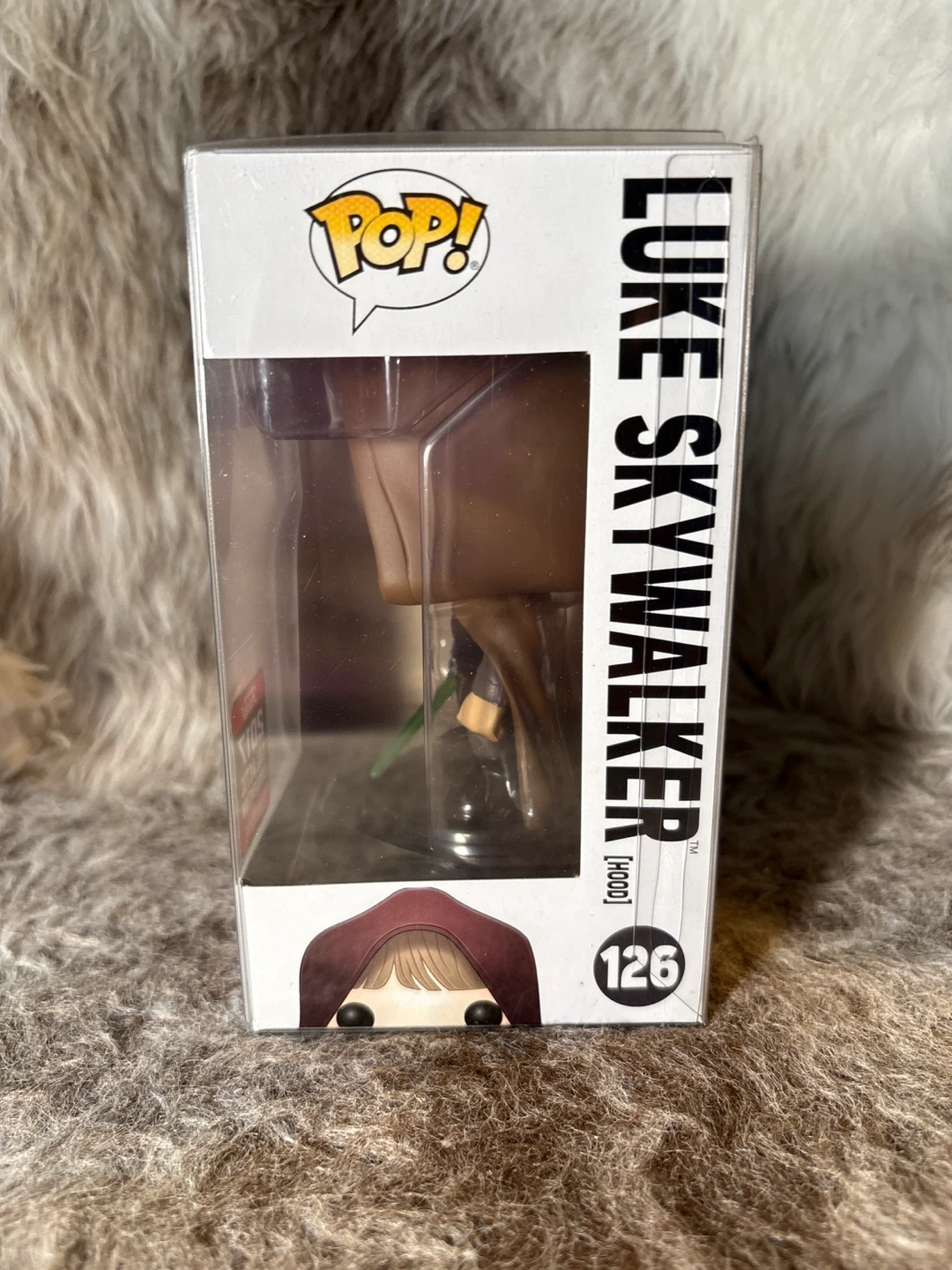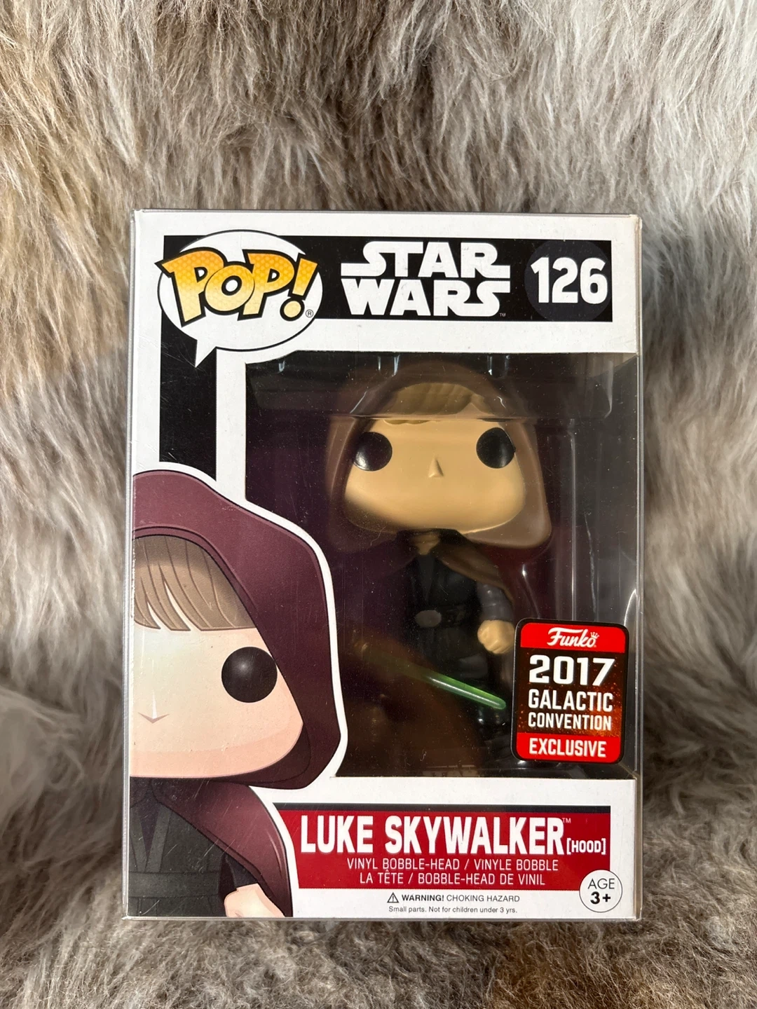 This is a Funko Pop! vinyl bobble-head of Luke Skywalker in his hood, number 126. This is a 2017 Galactic Convention Exclusive figure. In its original box with a protective sleeve.