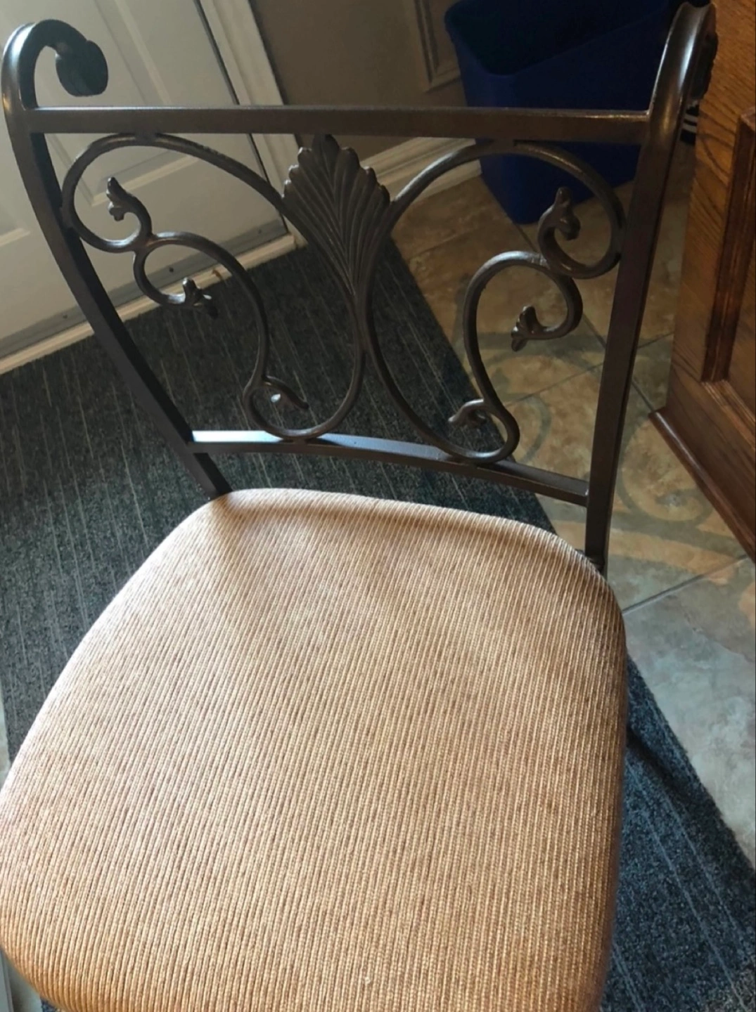 Selling 2 Wrought iron bar/ kitchen counter bar stool with a padded seat. The seat is beige with a striped fabric. The metal frame has a dark brown finish.