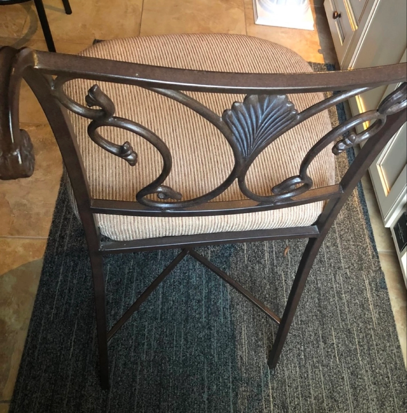Metal frame kitchen counter bar stool. Ornate detailing on the back. In good condition.
