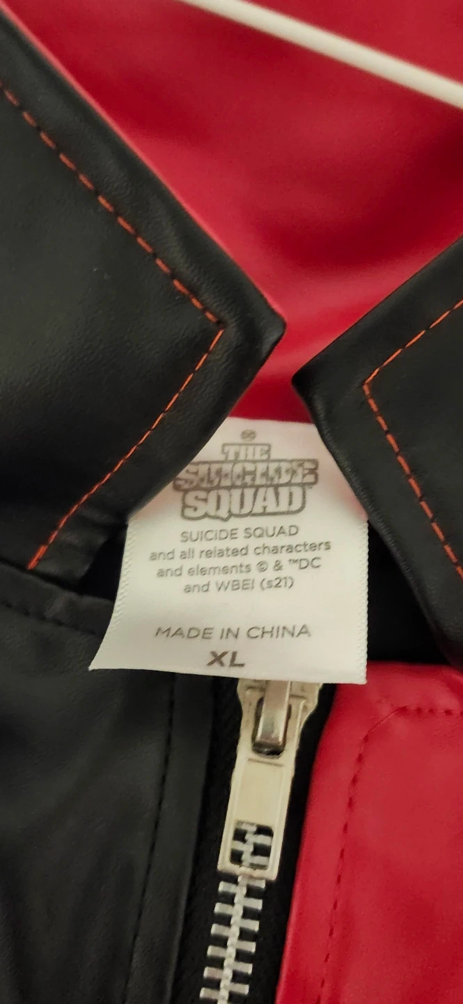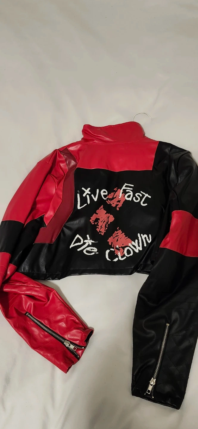 This cropped jacket is inspired by Suicide Squad. It features a red and black colour-blocking design with 'Live Fast Die Clown' text on the back. Size XL. Faux leather material.