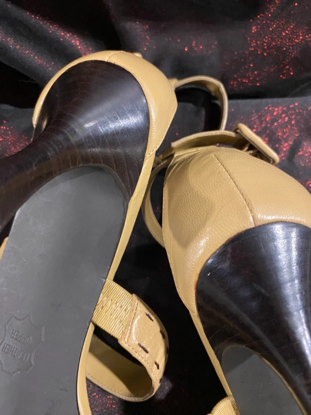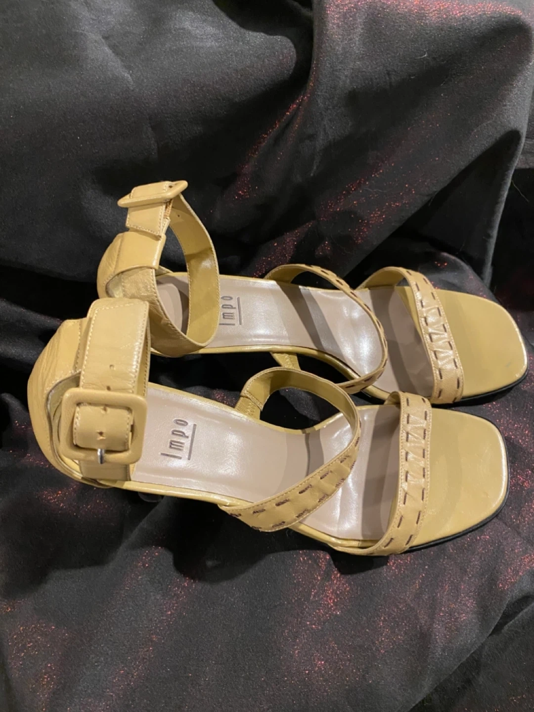 These are a pair of Impo beige leather heeled sandals. They feature an ankle strap with a buckle closure and a stylish design. Perfect for adding a touch of elegance to any outfit! Leather upper and sole.