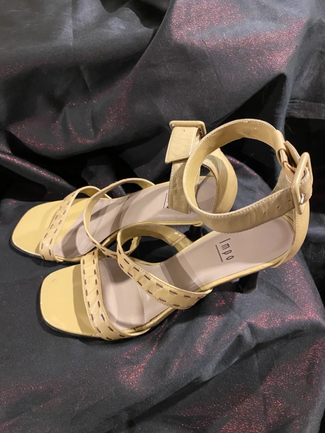 These are a pair of Impo beige leather heeled sandals. They feature an ankle strap with a buckle closure and a stylish design. Perfect for adding a touch of elegance to any outfit! Leather upper and sole.