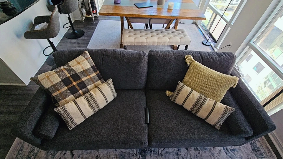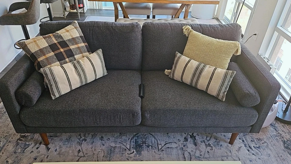 This versatile L-shaped sofa is perfect for any contemporary living room. It can be reconfigured into a comfortable 2-seater for smaller spaces. The sleek, dark grey fabric pairs effortlessly with the solid wooden legs, adding a touch of sophistication. Includes three stylish throw pillows to enhance comfort and aesthetic appeal.