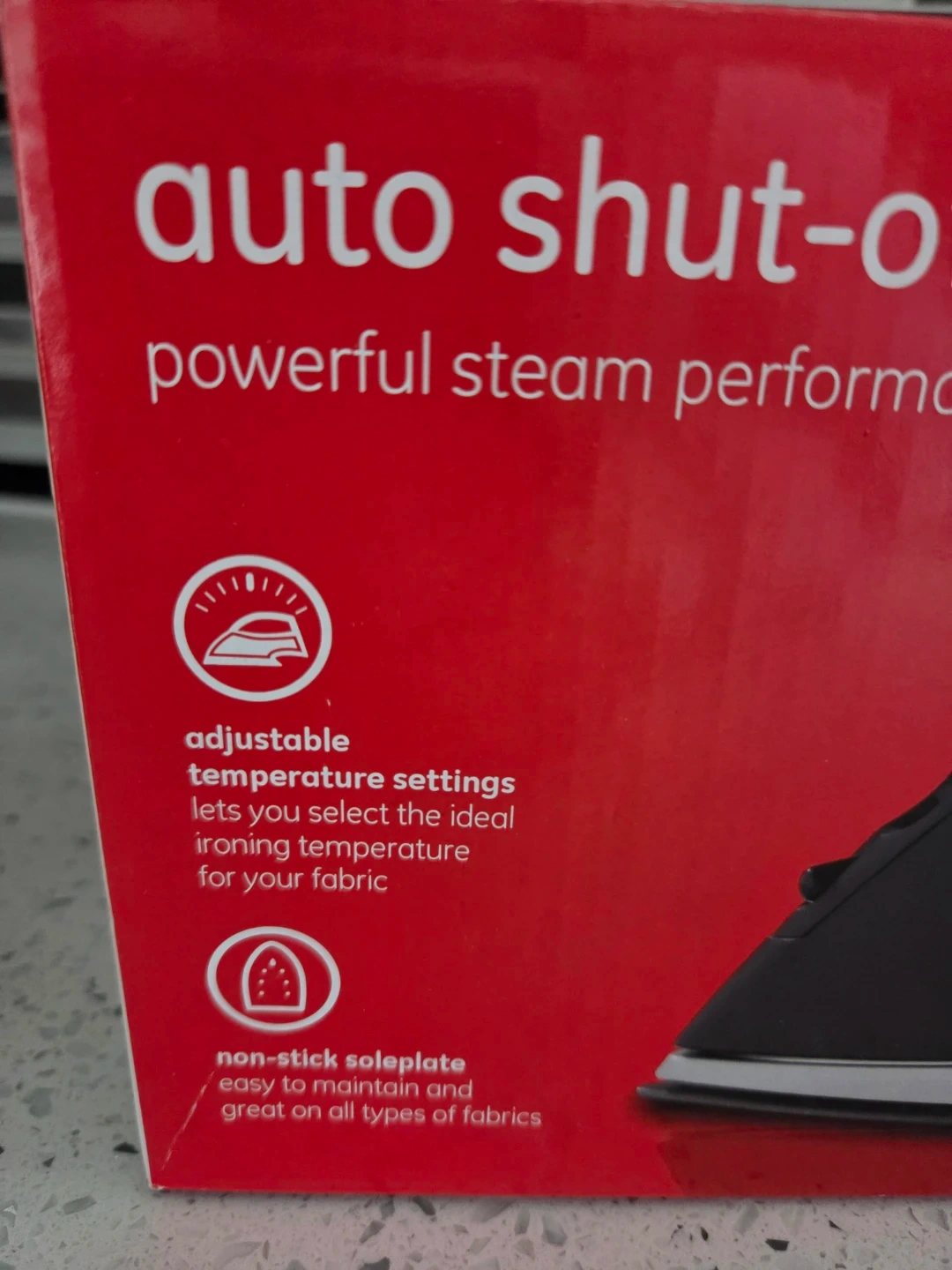 This GE iron offers powerful steam performance and features auto shut-off for safety. It has adjustable temperature settings to select the ideal ironing temperature for your fabric. The non-stick soleplate is easy to maintain and great on all types of fabrics.
