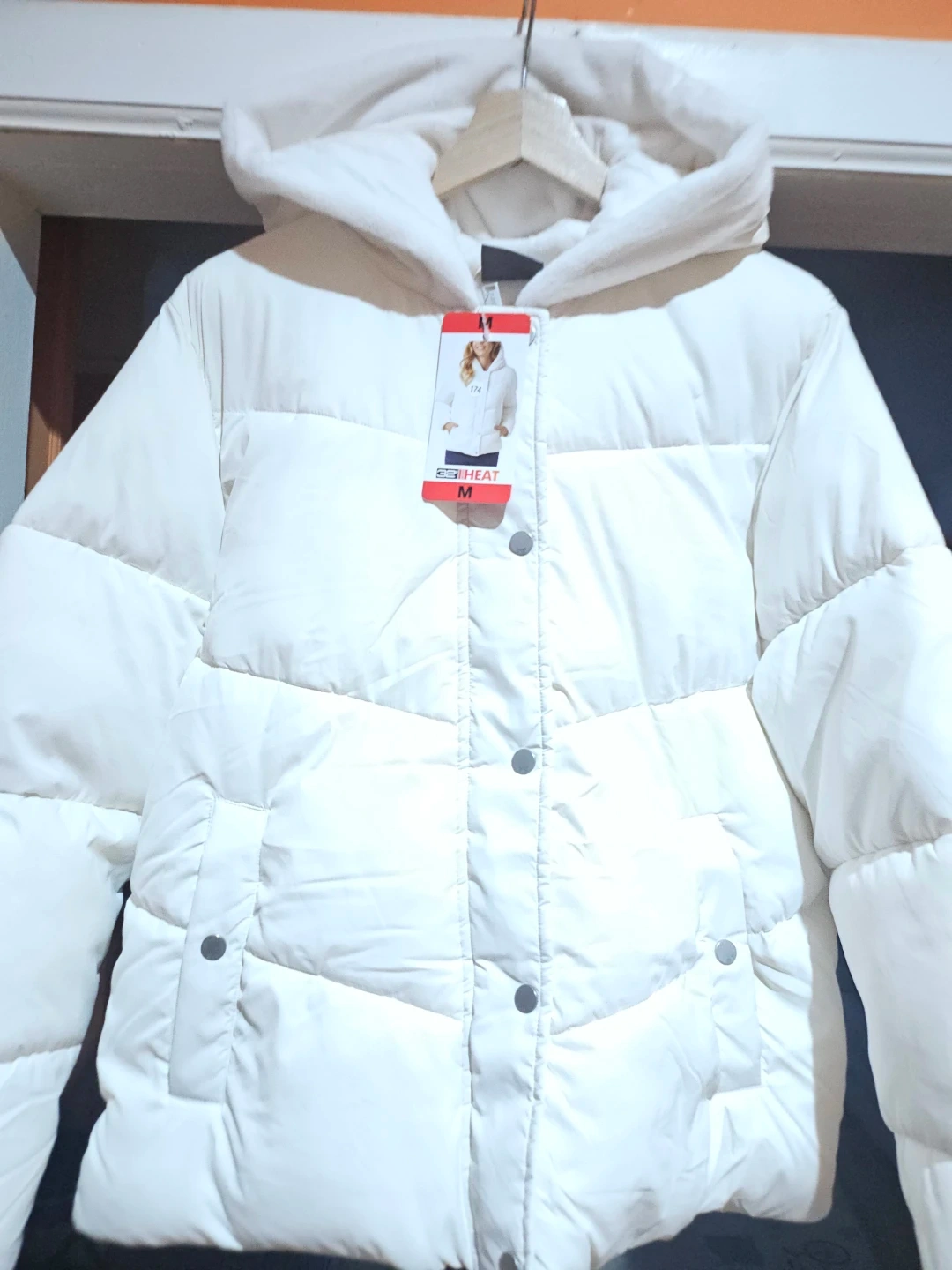 Stay warm in this 32 Degrees Heat puffer jacket. It's white and features a hood. This jacket is a size medium.