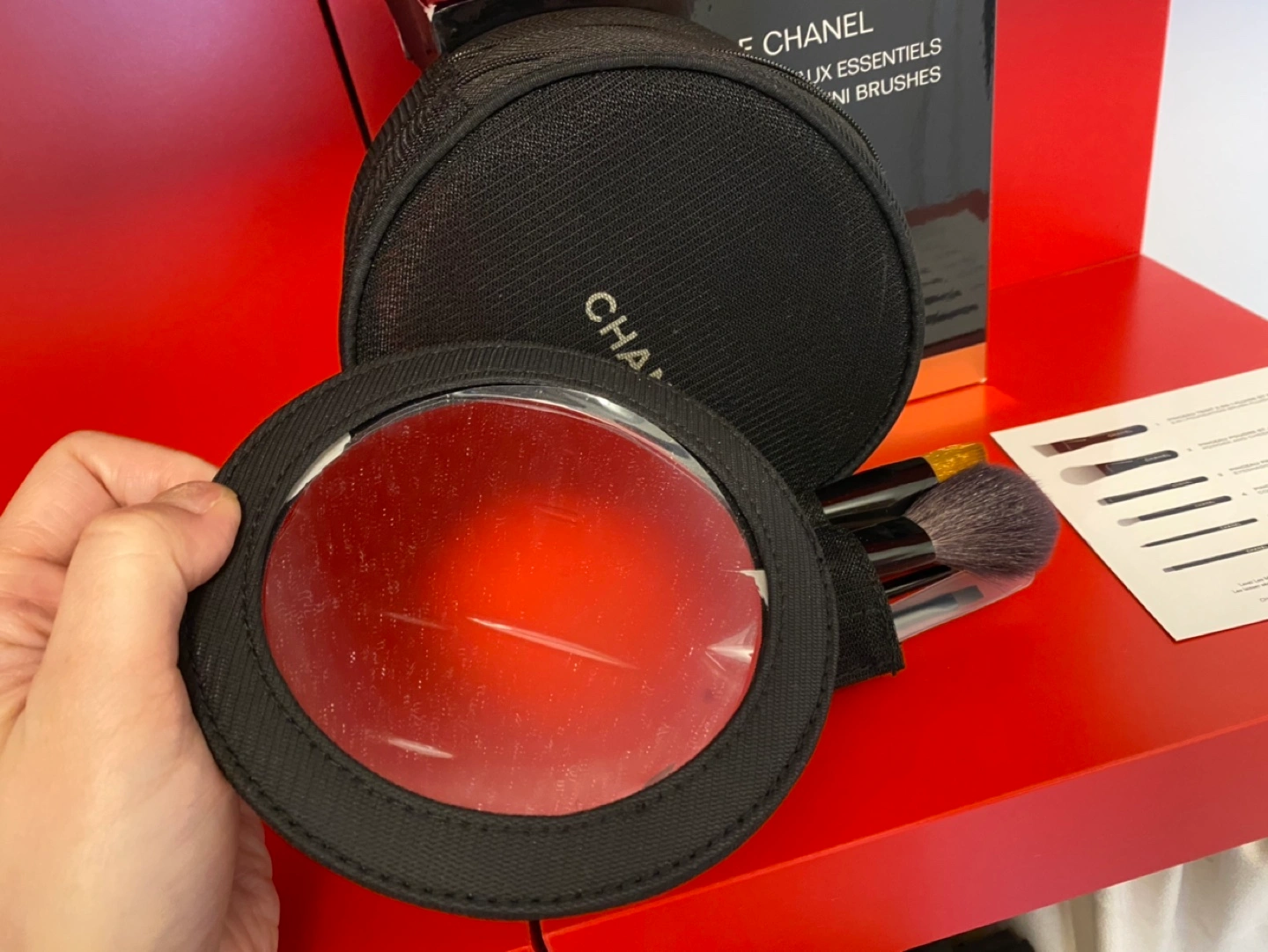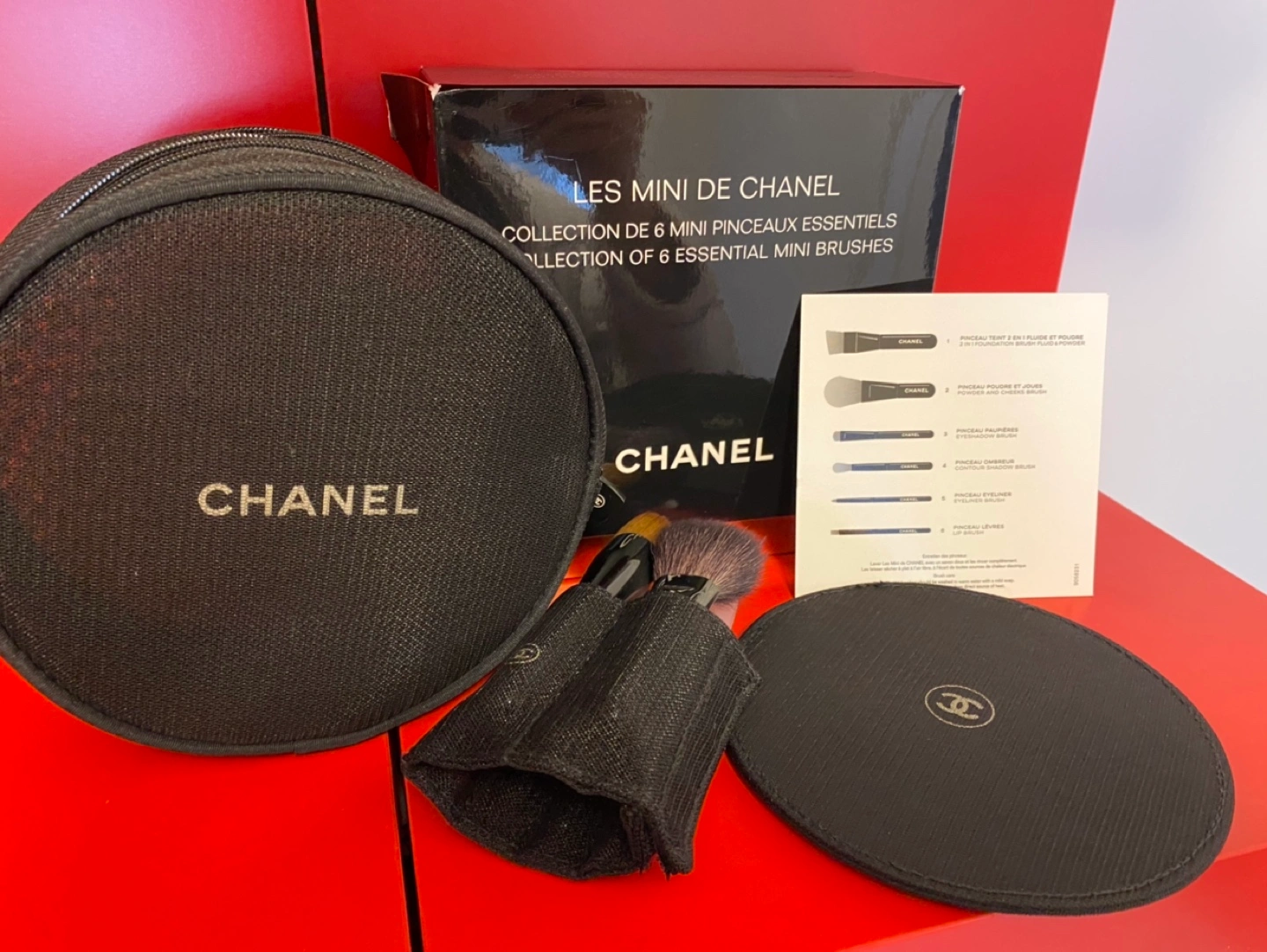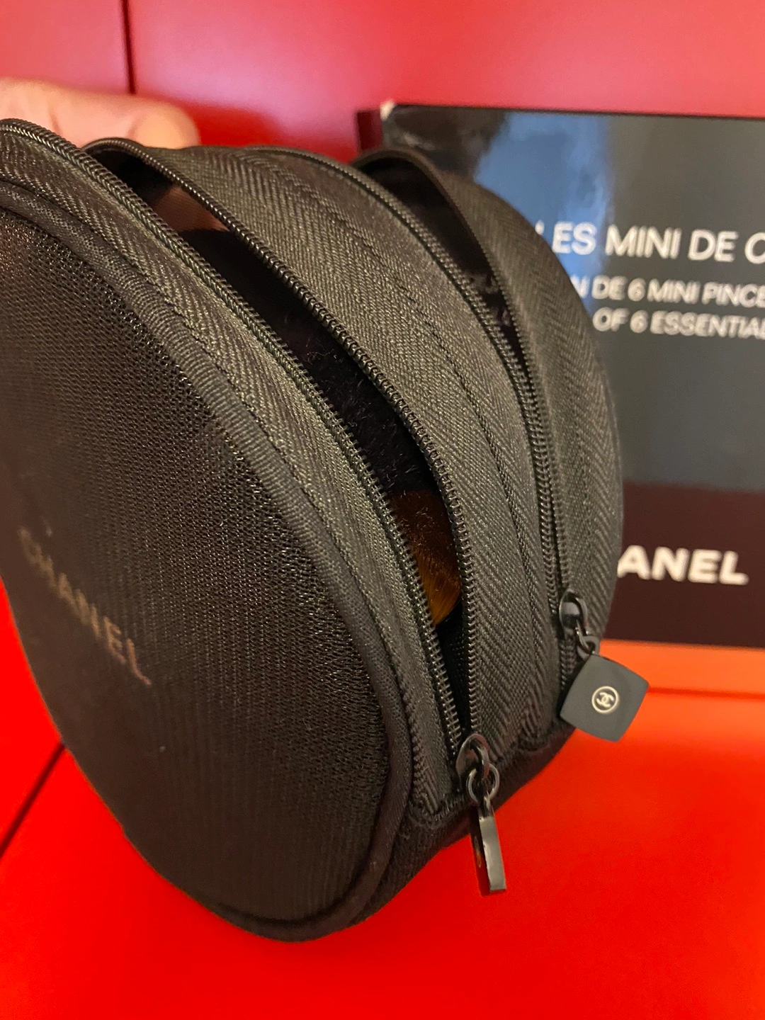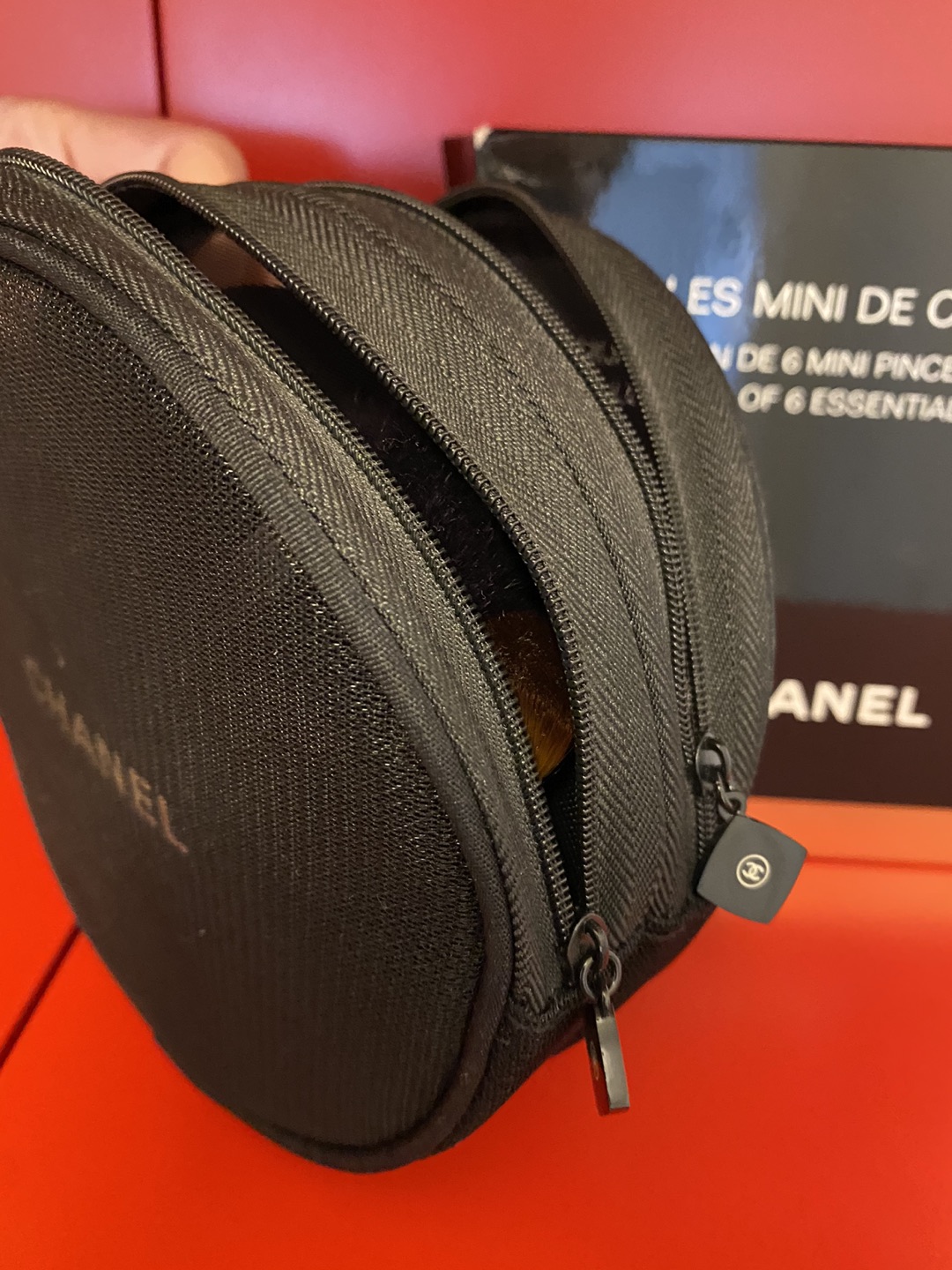 this Chanel package is still a lovely gift for a professional lady traveler. Oftentimes, accompanying bags are cheap, but this is a winning zip-up. Set includes a powder brush, face brush, eyeshadow brush, blending brush and angled shadow brush. As well as a mirror.