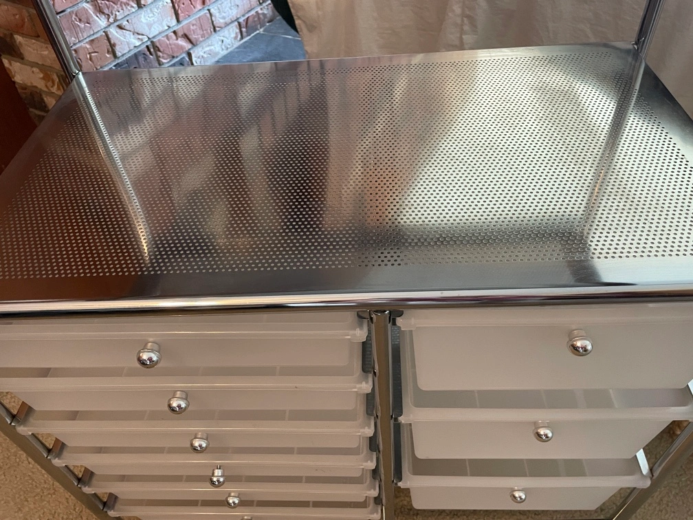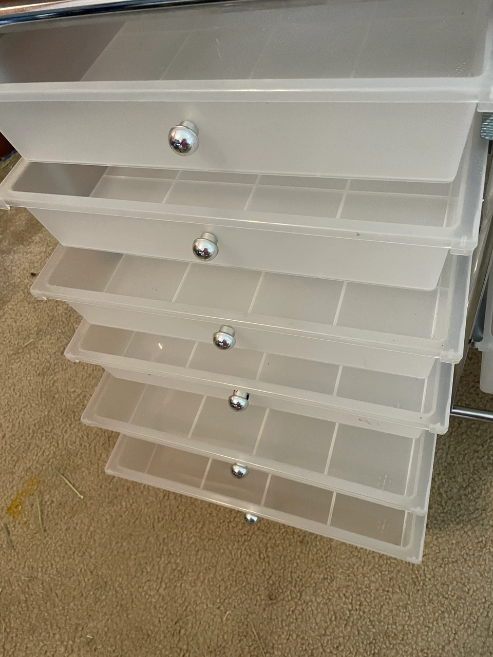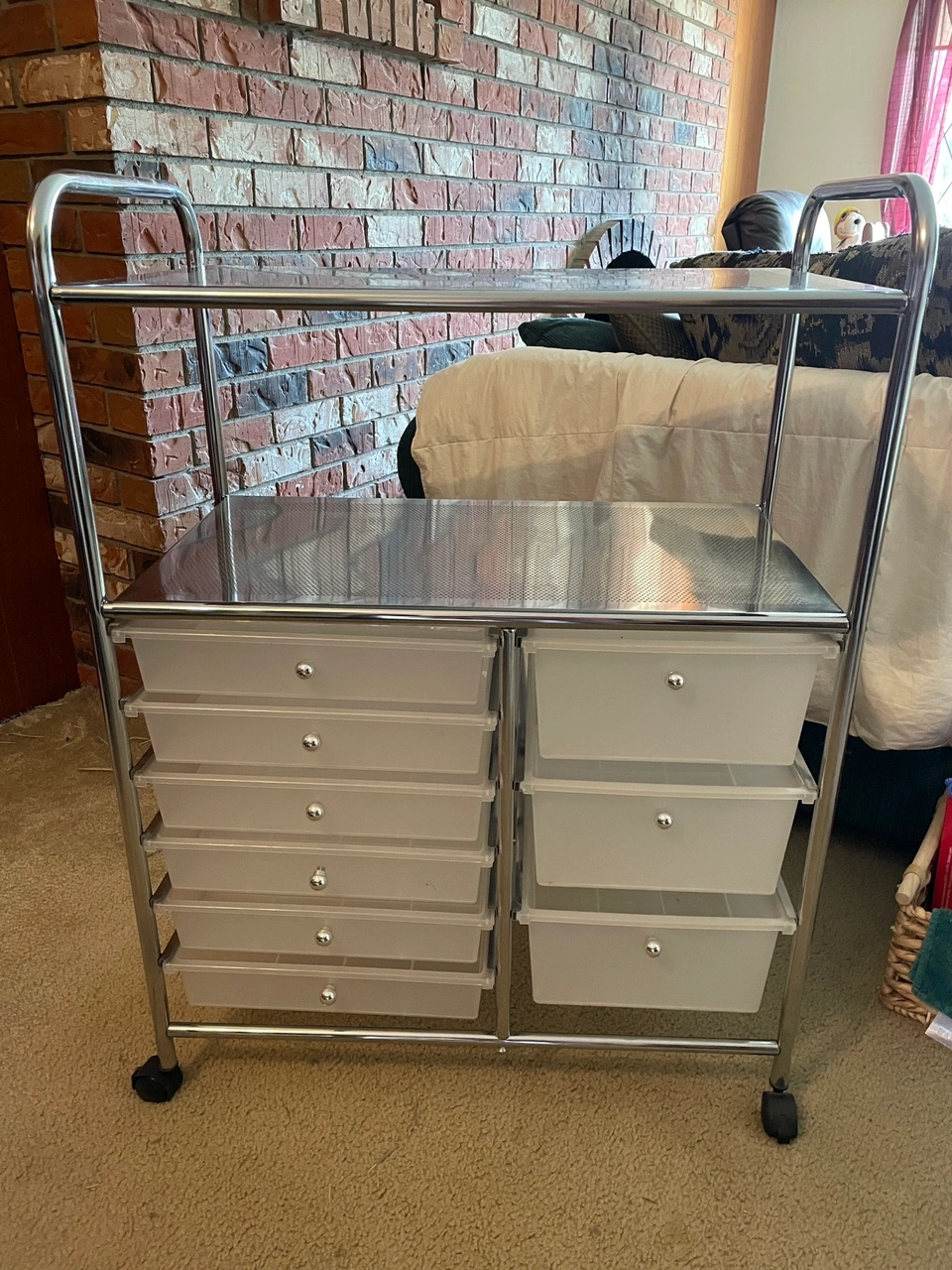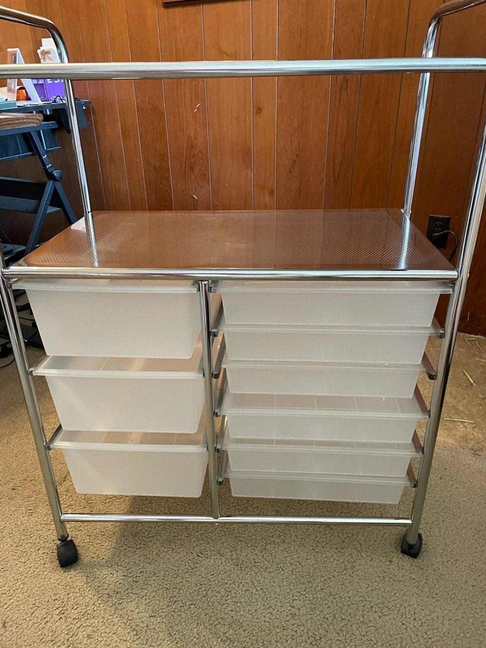 Used to store craft supplies. Light yet durable with six shallow hard plastic drawers on one side with three deep drawers on the other side and is on wheels. A few stains on the top shelf and one of the drawers has a cracked/loose handle (see photos). $10 firm. Cash only and pick up in the Metrotown area.