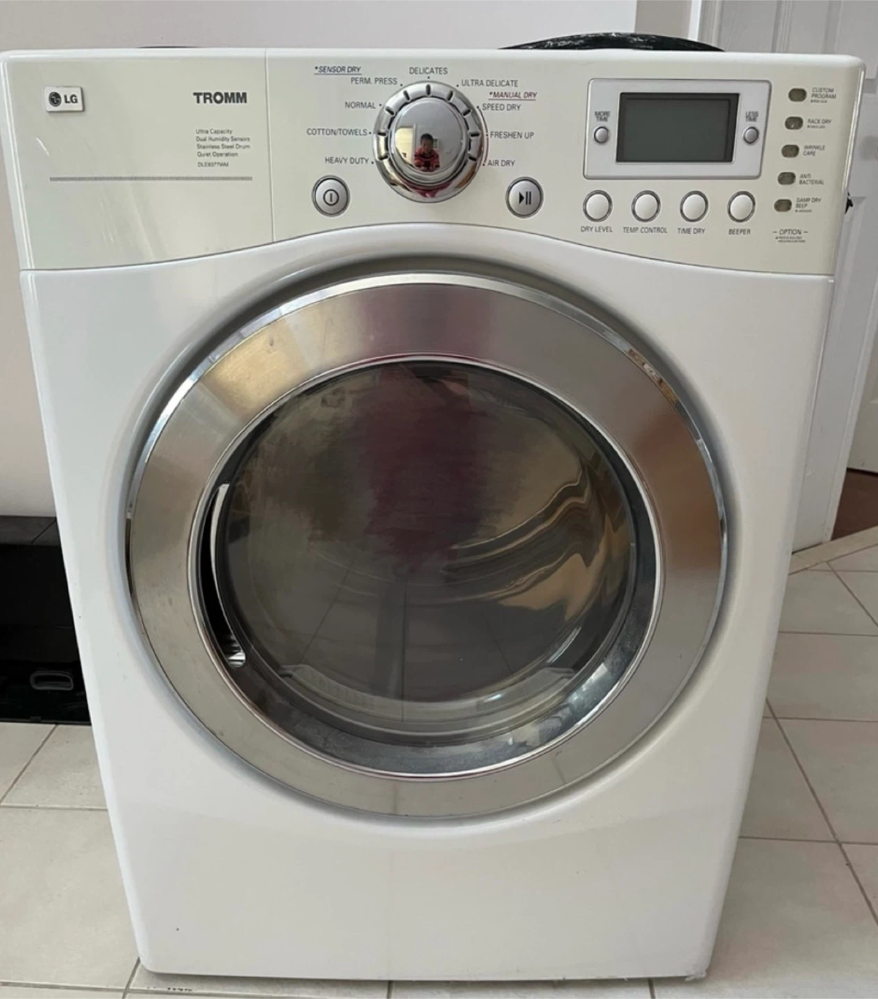 LG TROMM electric dryer with ultra capacity and dual humidity sensors. Features a stainless steel drum for quiet operation. Includes multiple dry cycles like Sensor Dry, Delicates, Perm Press, Normal, Cotton/Towels, Heavy Duty, Ultra Delicate, Manual Dry, Speed Dry, Freshen Up, and Air Dry. Offers options for Dry Level, Temp Control, Time Dry, and a Beeper.