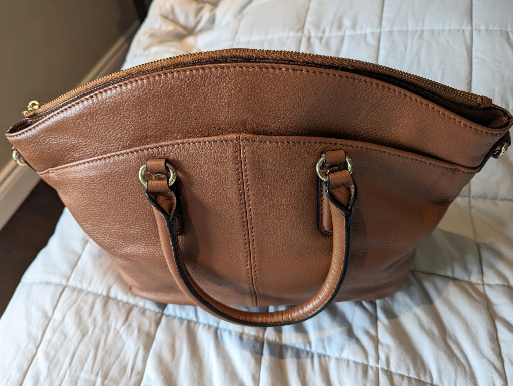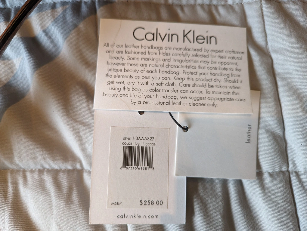 Like New Calvin Klein Leather Satchel, Used once. Has a strap to make it a crossbody. Many compartments, lots of space. Large interior section closed with magnet has one zipped pocket and two slip pockets. One large interior section with zipper close. 2 outer pockets with magnetic closure. Comes with dust bag and shoulder strap 29 inches, has other holes so that it can be made shorter. Length: 15 inches, Height: 11 inches, Width: 5 inches Bought for $258 USD = $360 CAD