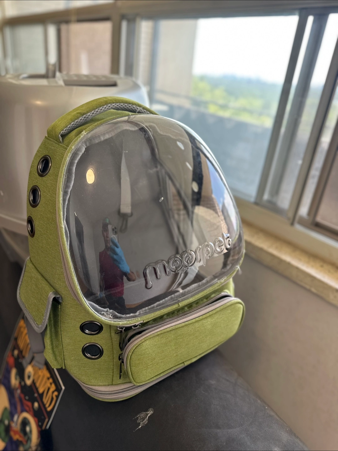 rush for sale a Morpaw pet carrier backpack in green! It's in great condition and perfect for taking your furry friend on adventures. It features a clear bubble window so your pet can enjoy the view.
