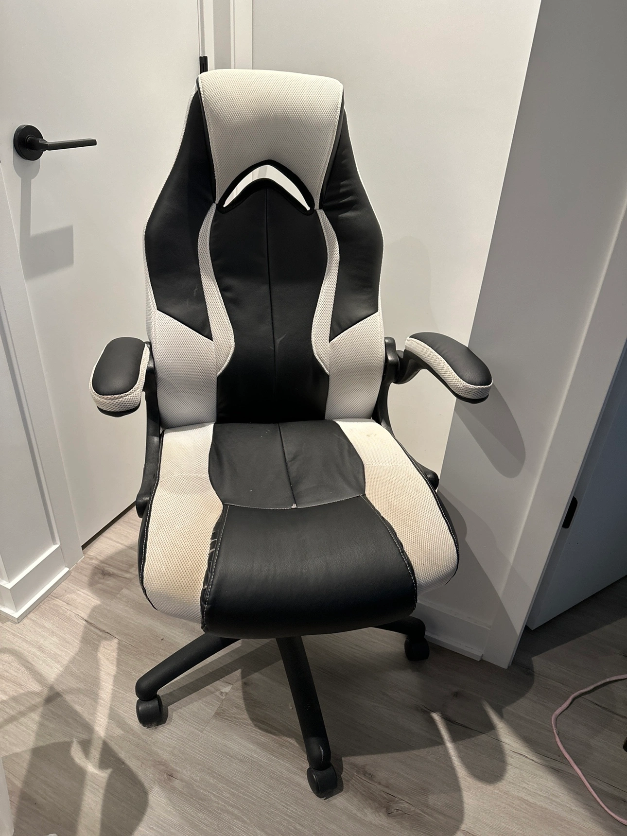 This comfortable and stylish gaming chair is perfect for long hours of gaming or work. It features an ergonomic design to support your posture. Despite a few minor stains, it remains in good condition. Ideal for enhancing your gaming setup or office space.
