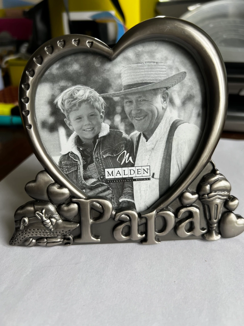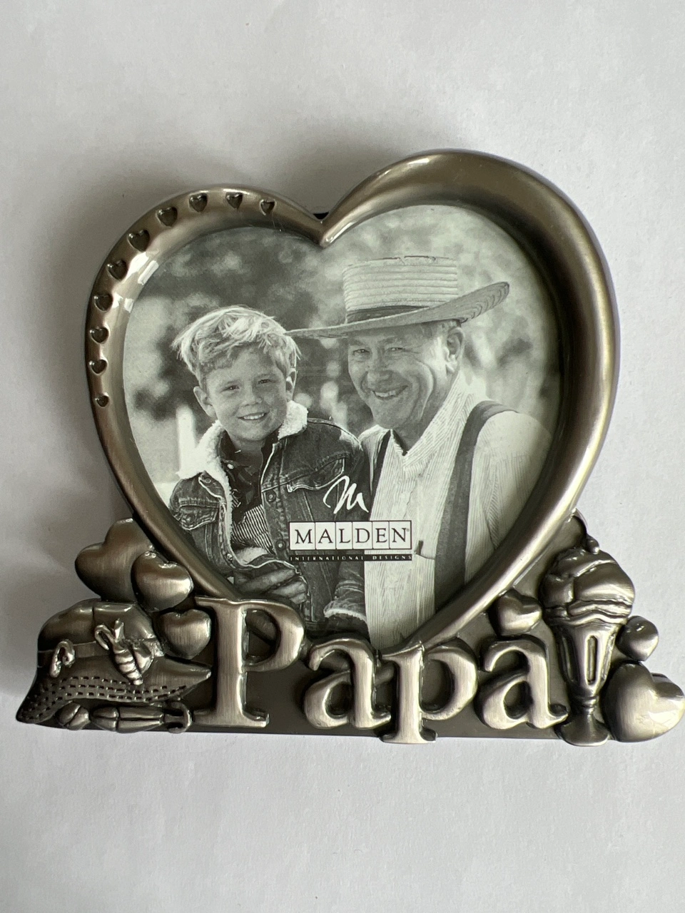 Silver, heart shaped picture frame with inscribed word “Papa” on the front.