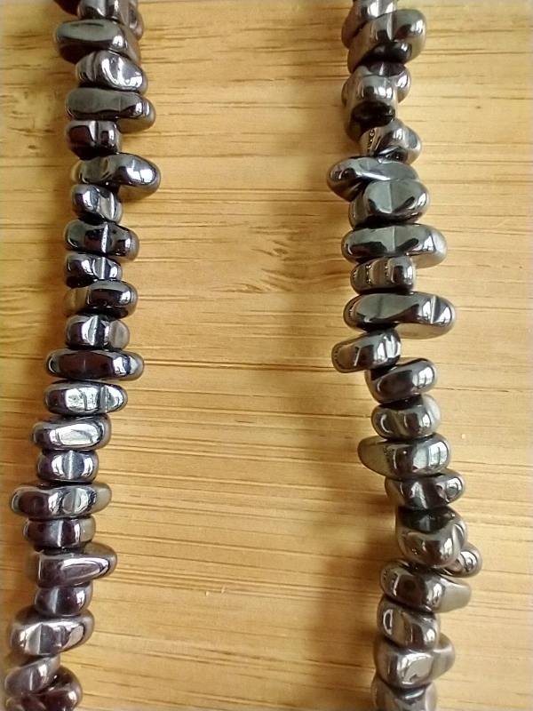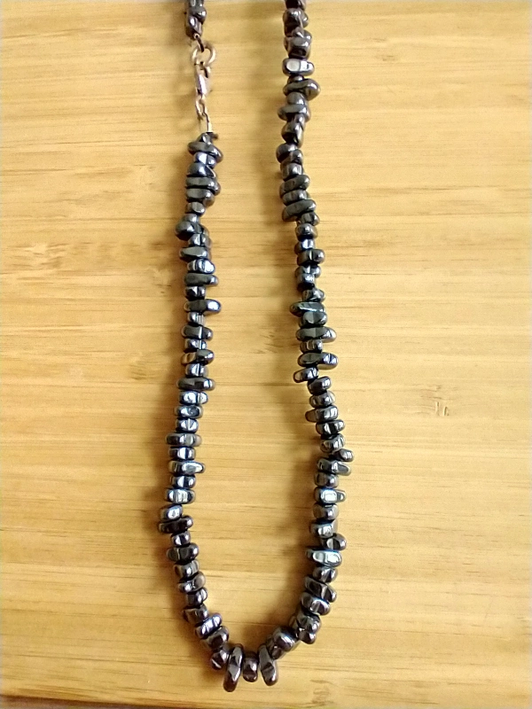 Irregular shaped beads with silver clasp. Hematite believed to possess healing properties, enhance memory, promote circulation.