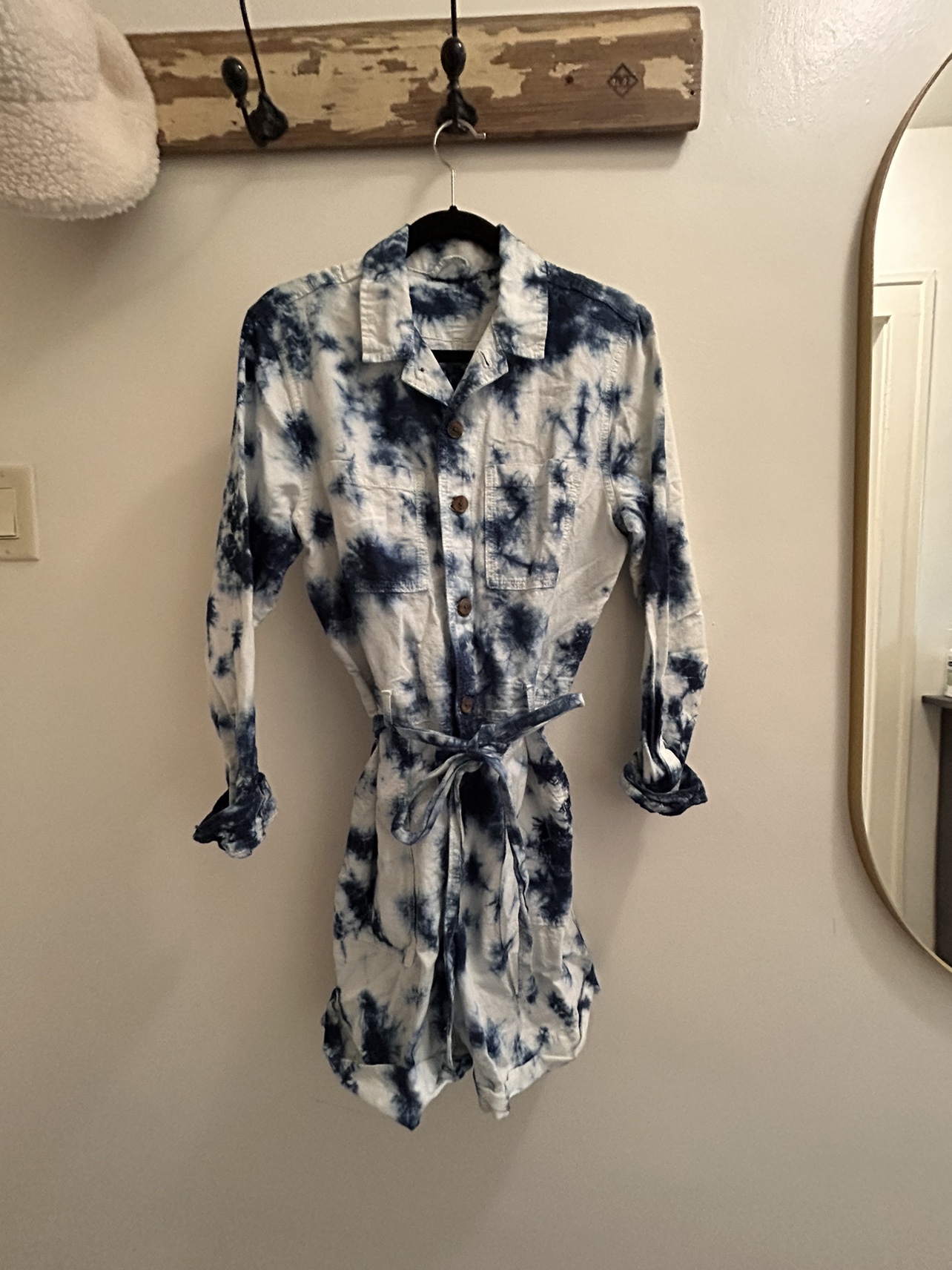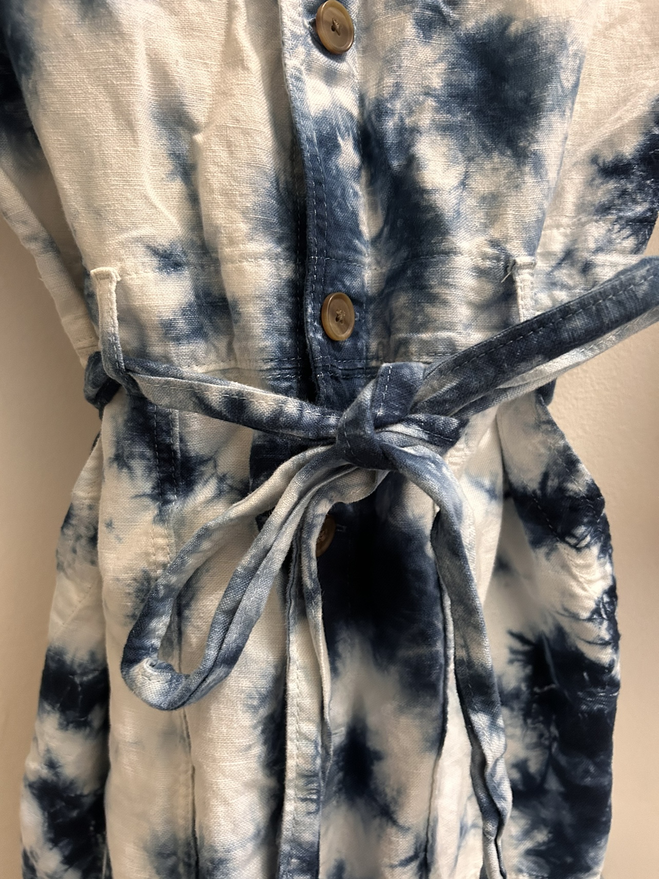 Worn only once! Ready for a new owner :) This jumpsuit is really cute and in great condition. Has buttons and a waist tie for a more cinched look. You can cuff the sleeves and pant legs as well.