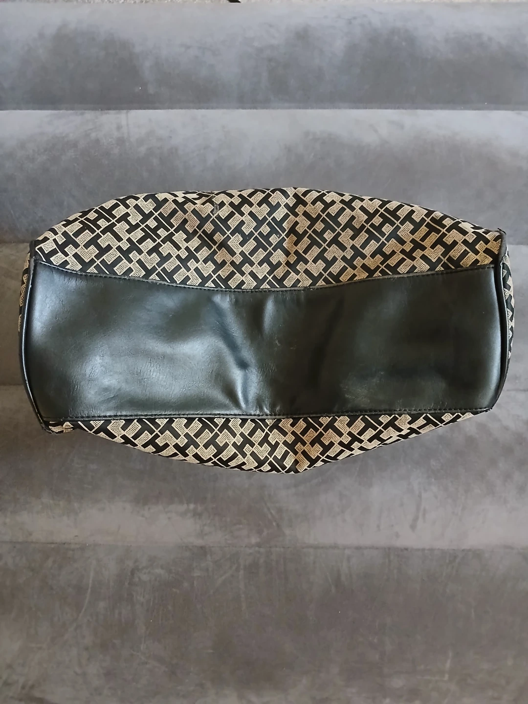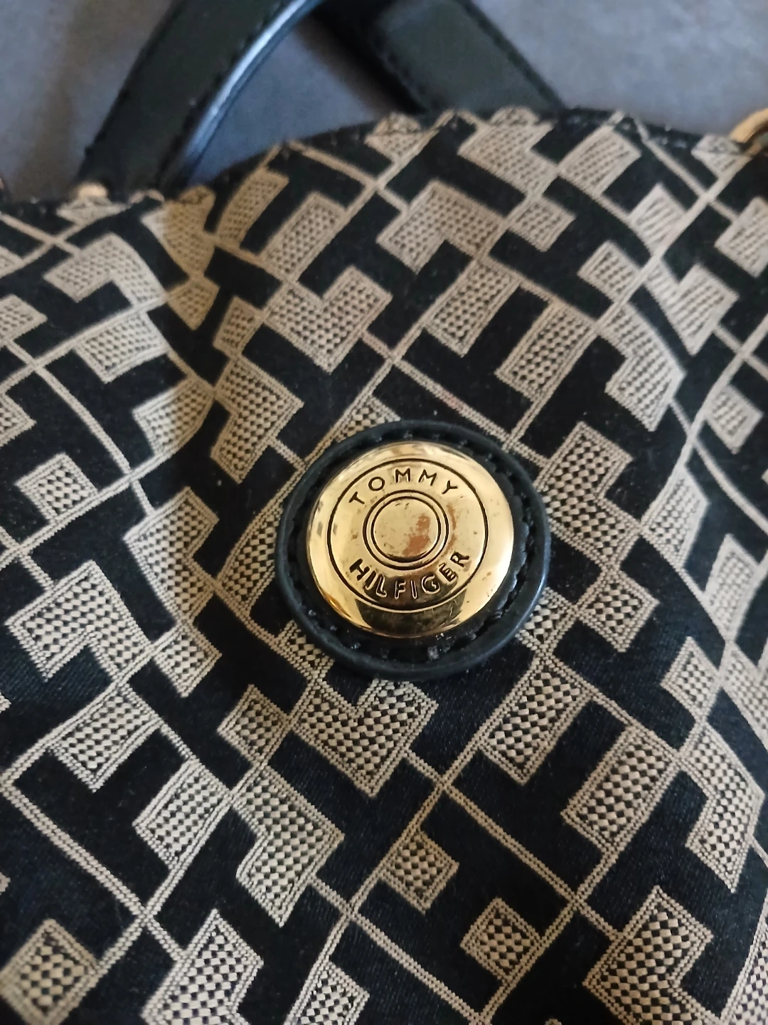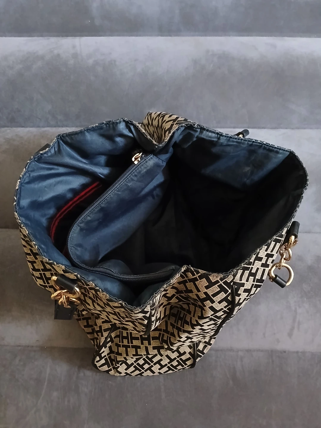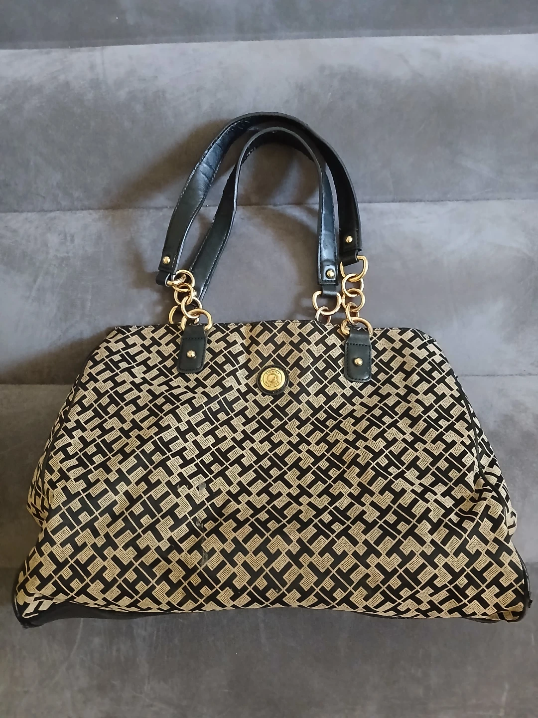 Lightly used Tommy Hilfiger tote bag with signature 'TH' monogram pattern. Features black leather accents and gold chain detailing. Interior has 2 zippered compartments, 1 small open pocket compartment, and 2 open main compartments. Cash only. Pick up or meet up in public place. Willing to bargain on the price.