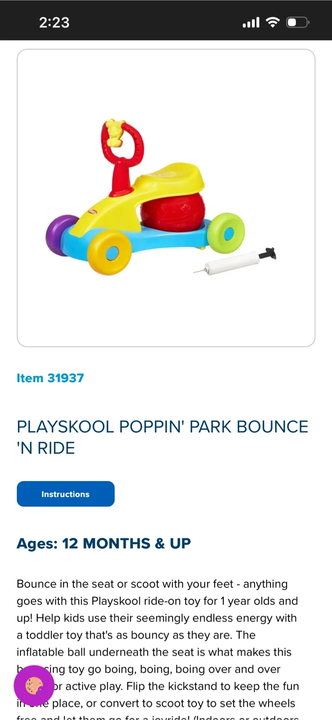 This Playskool Poppin' Park Bounce 'n Ride toy is great for toddlers. It can be used for bouncing or scooting, with an inflatable ball underneath the seat. The kickstand can be flipped to keep it in place or set the wheels free for riding indoors or outdoors.