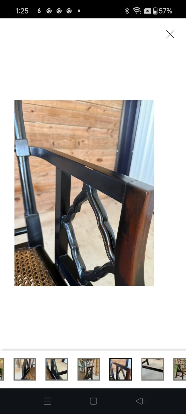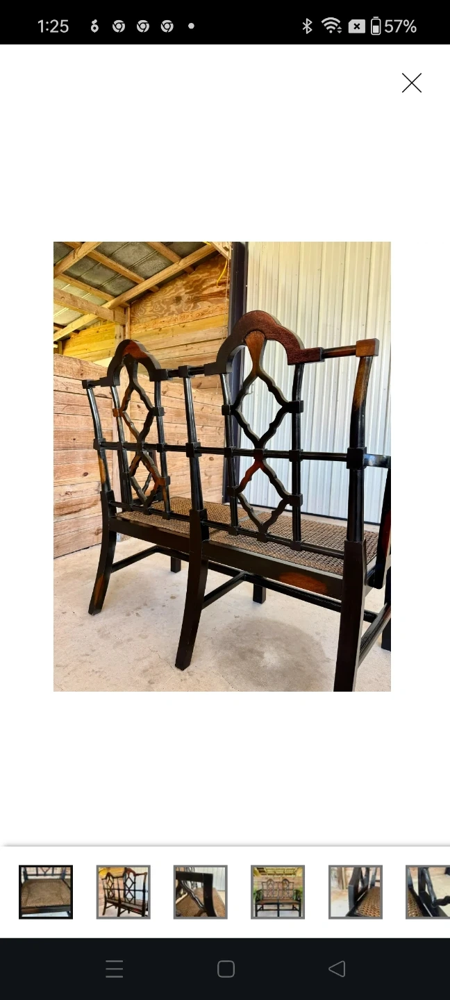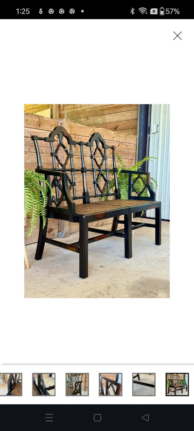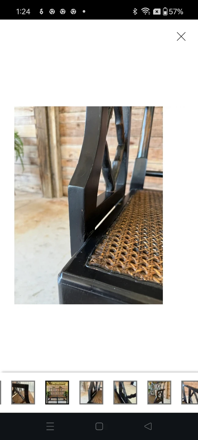 This solid wood bench has a woven seat. It's a two-seater design with decorative detailing on the frame. The seat material is woven cane. One of the seats woven came material has been removed needs replacing....