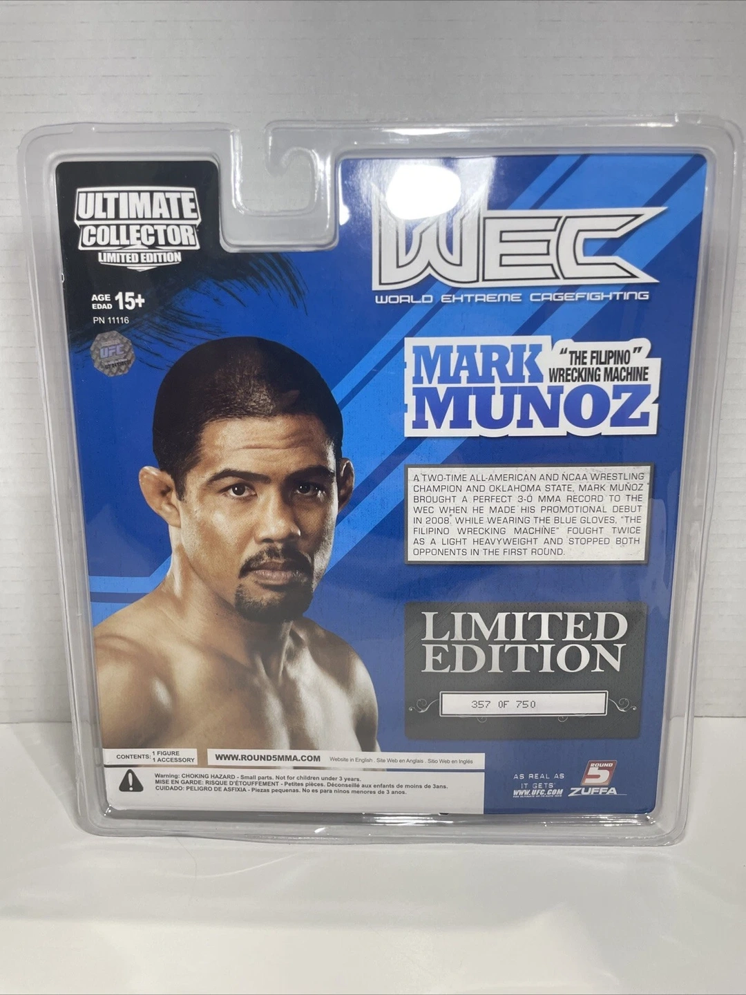 Limited Edition Mark Munoz action figure from Round 5, part of the UFC WEC series. This is figure number 357 out of 750. It's a 1:12 scale figure, about 6 inches tall, made of ABS plastic. The packaging is original and unopened. This item was manufactured in 2011.