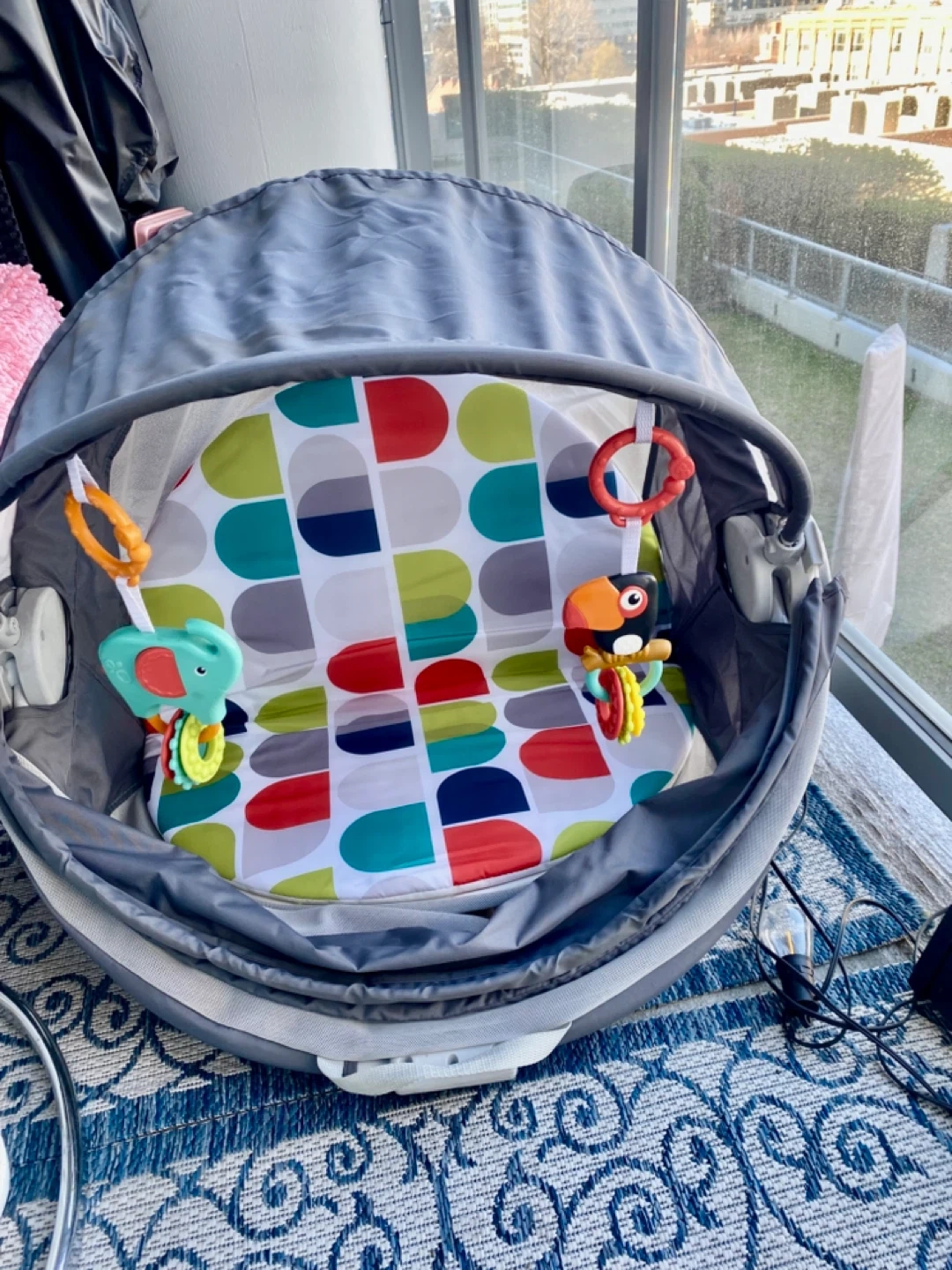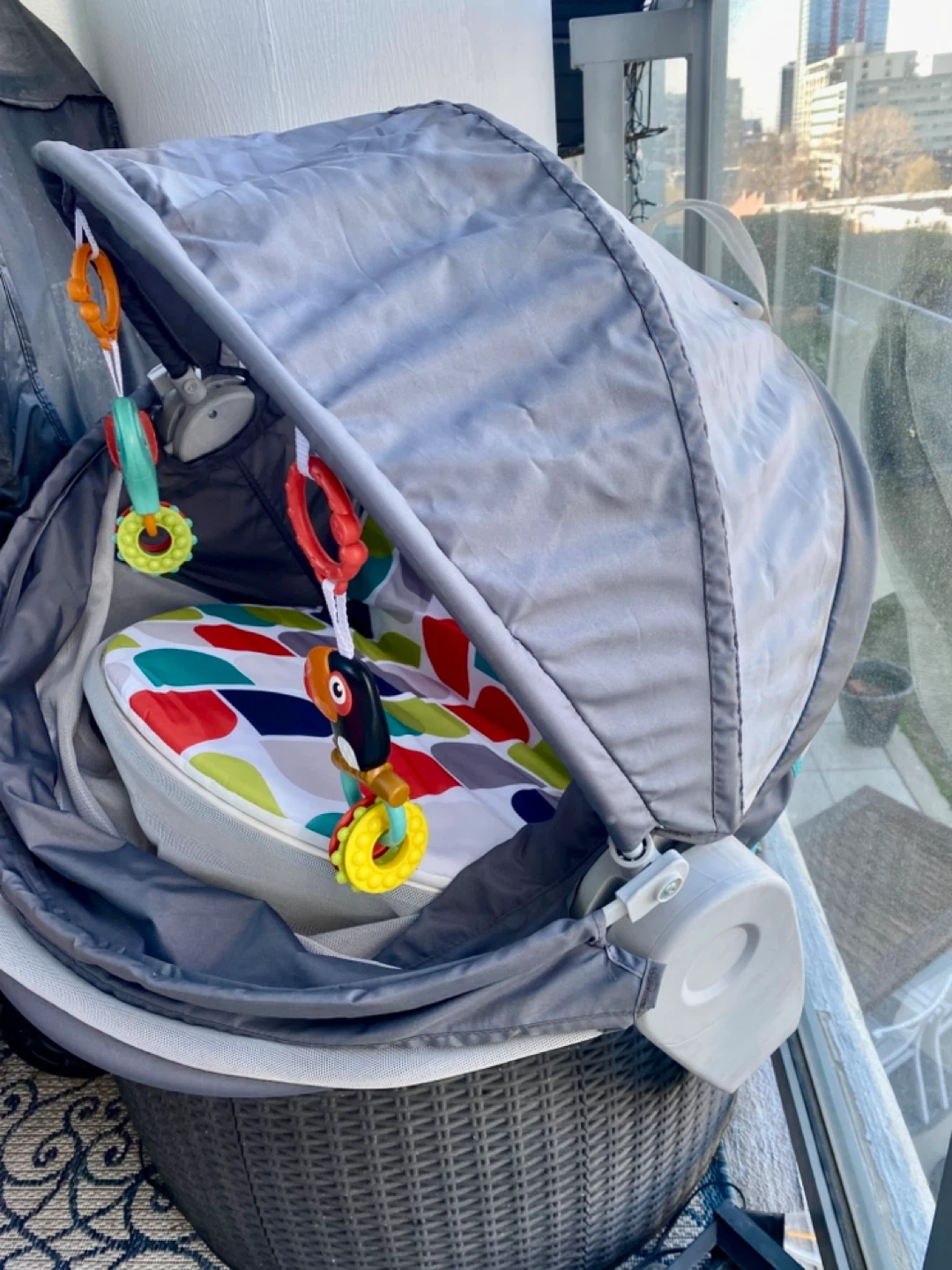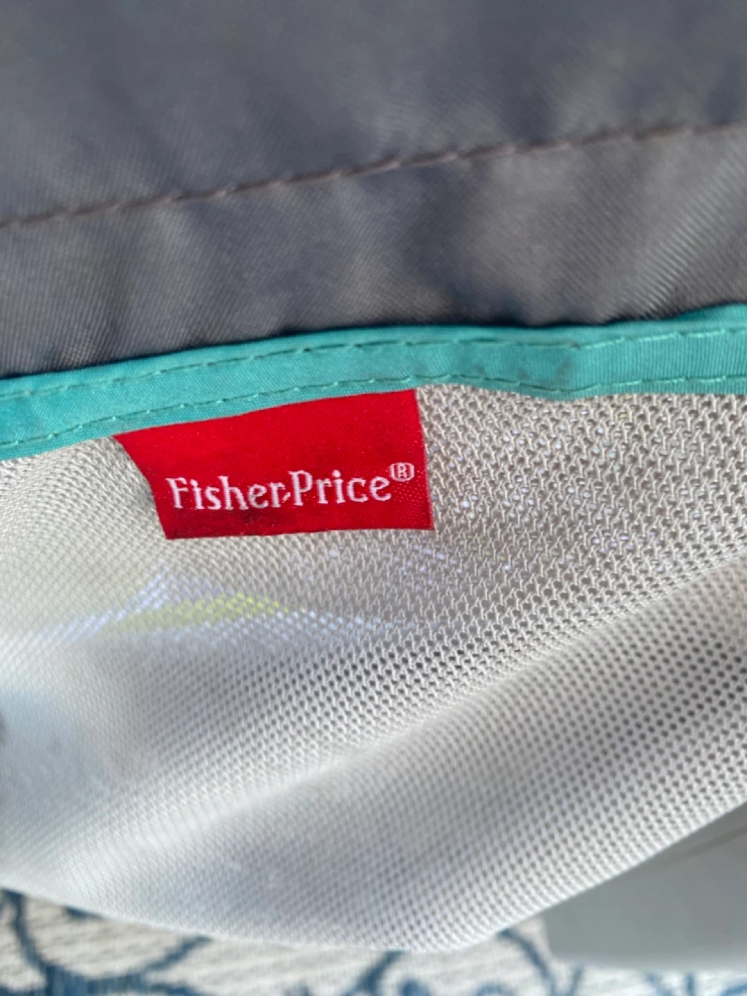 Fisher-Price baby bouncer seat. Features a colorful patterned seat and hanging toys for entertainment. It's suitable for infants and toddlers. Provides a comfy spot for babies to relax and play!