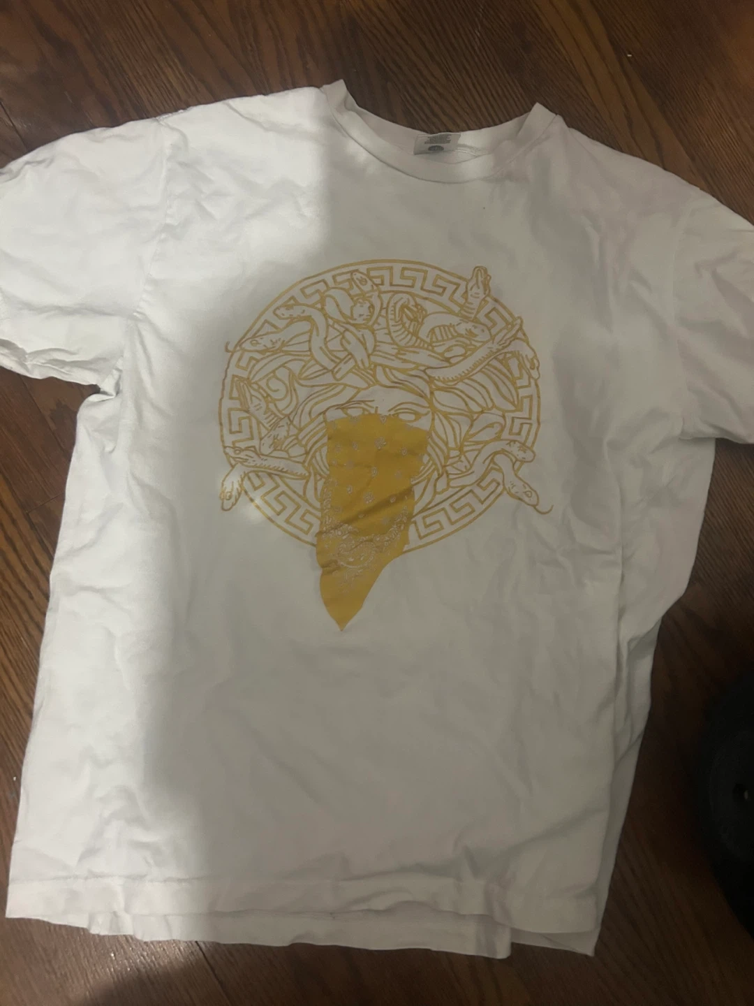 Taking trades as well White t-shirt with a large yellow graphic of Medusa. It's a standard crew neck, short-sleeved tee. Made from soft cotton material. This shirt's a great statement piece for your casual wardrobe!