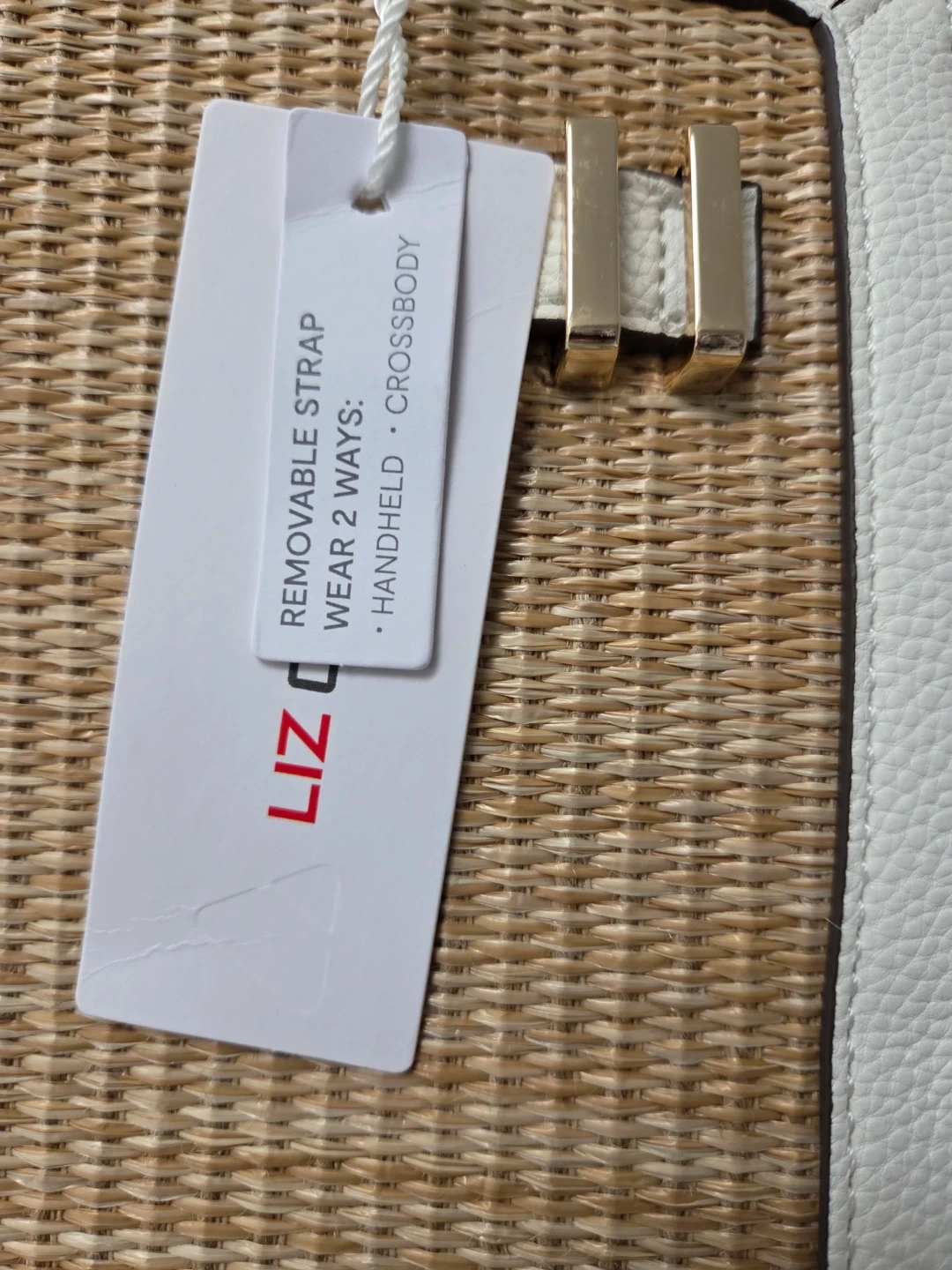 This Liz Claiborne tote bag features a woven straw body with white faux leather trim. It has a removable strap and can be worn as a crossbody or handheld bag. The interior has zippered pockets for organization. It's a stylish accessory for everyday use!