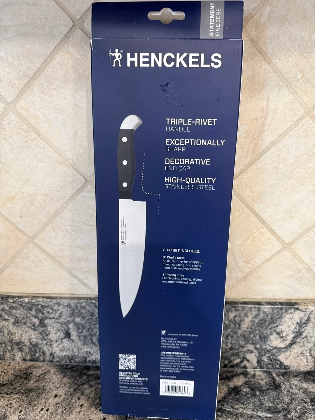 This is a 2-piece Henckels chef's set. It includes a 8" chef's knife and a 3" paring knife. The knives feature high-quality stainless steel blades with triple-rivet handles. Lifetime warranty, dishwasher safe!