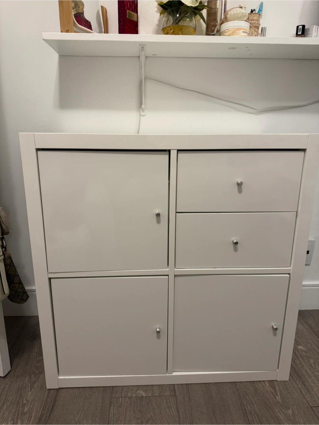 White IKEA KALLAX Shelving Unit with Doors and Drawers