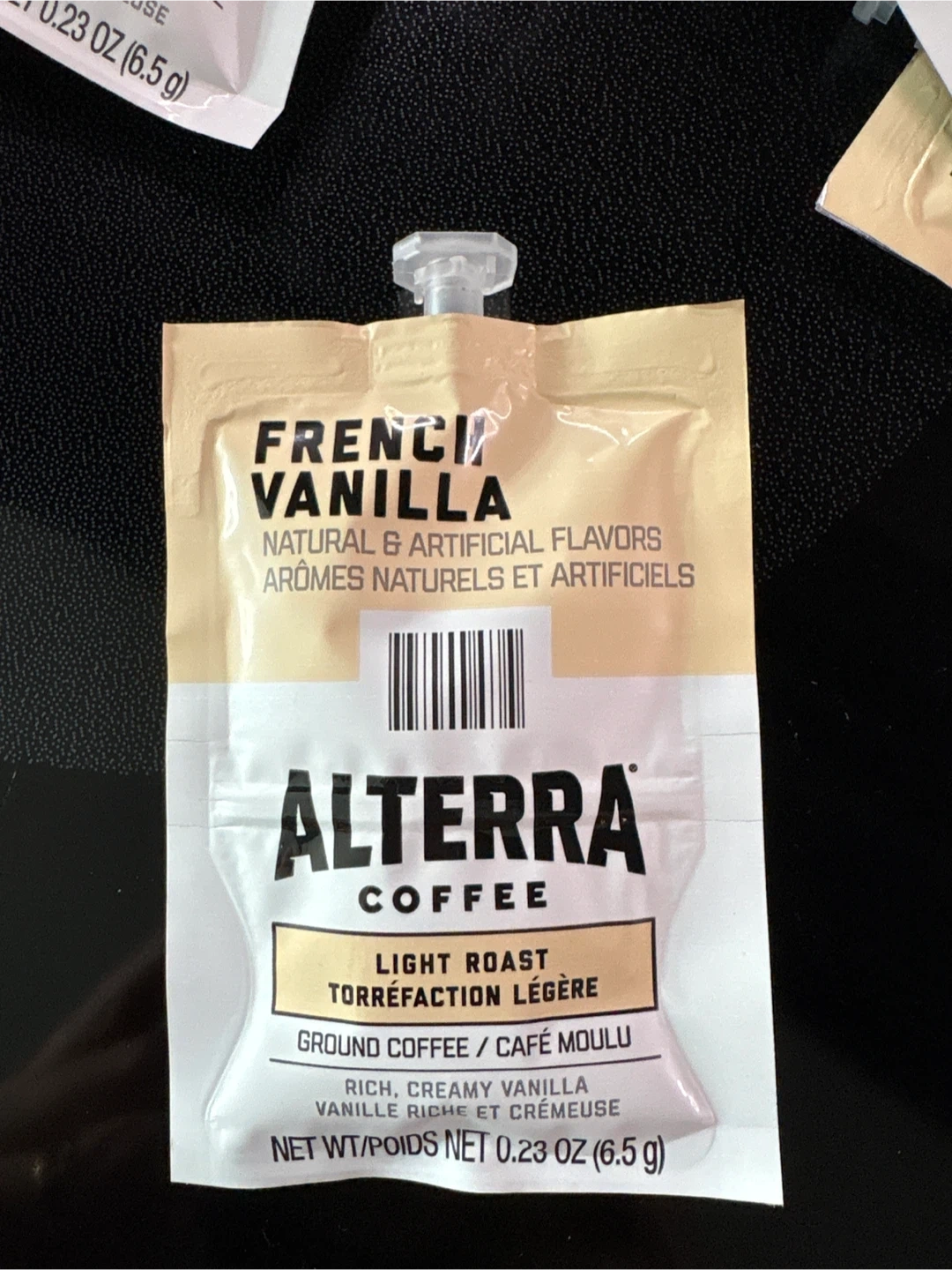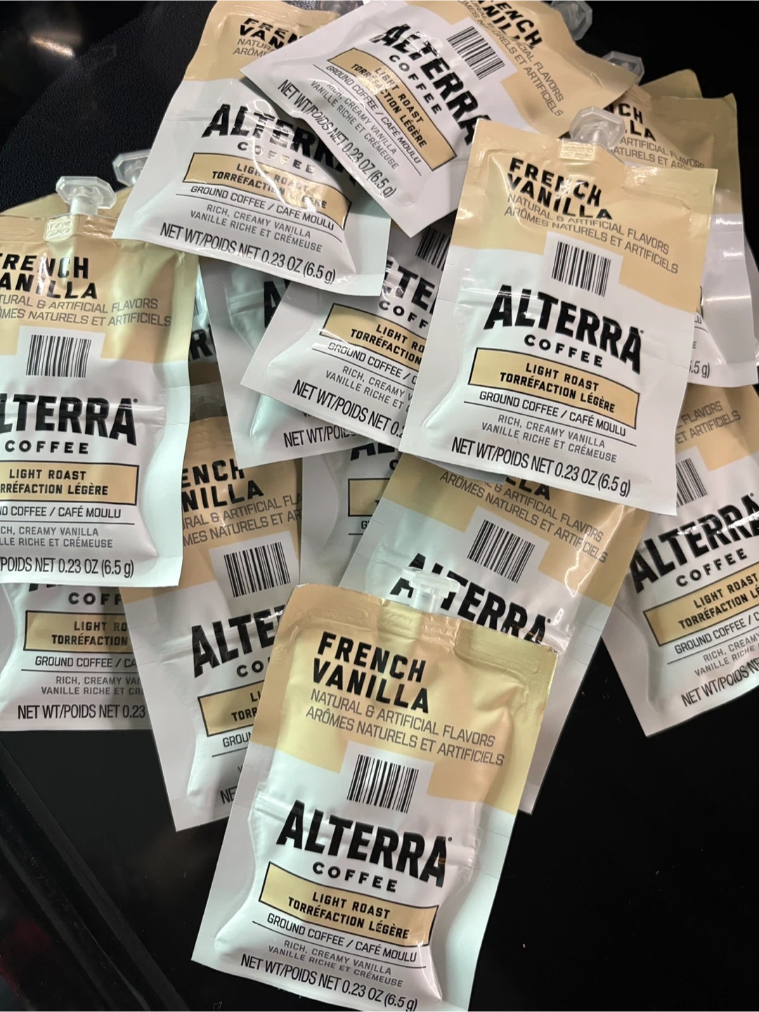 FLAVIA Alterra Coffee - French Vanilla Fresh Packs ground coffee comes in single-serve pouches. Each pouch contains 0.23 oz (6.5 g) of coffee. This is a great option for a quick, individual cup of coffee!