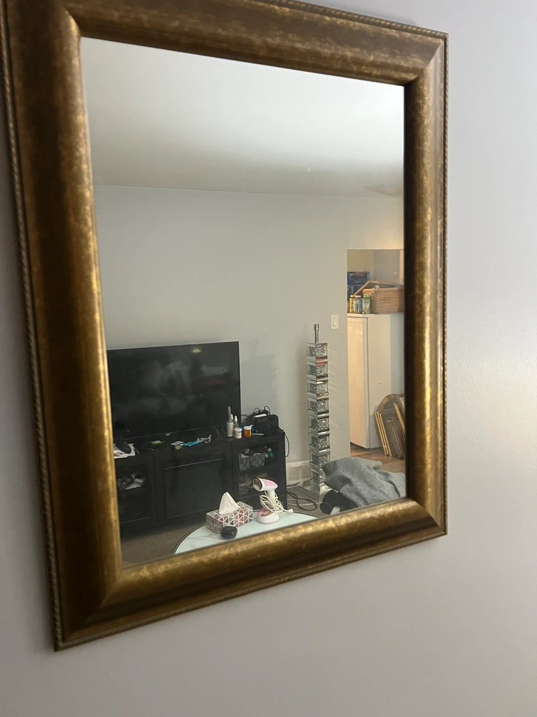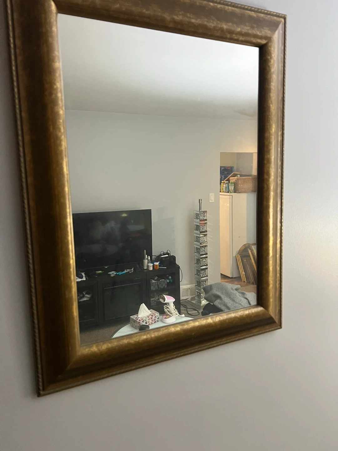Gold-toned decorative wall mirror. Its ornate frame adds a touch of elegance to any room. Mirror's dimensions are approximately 20 inches by 26 inches.
