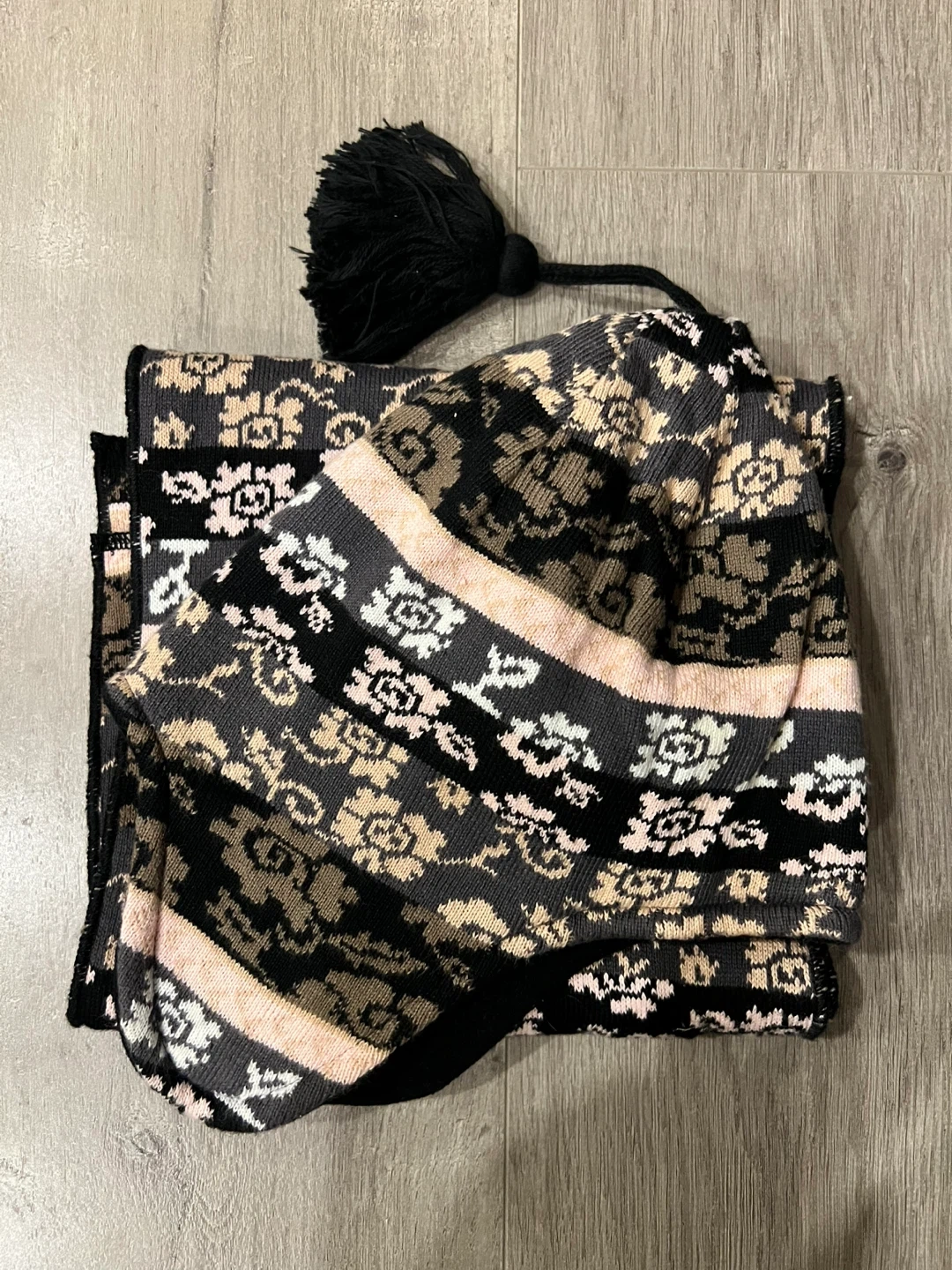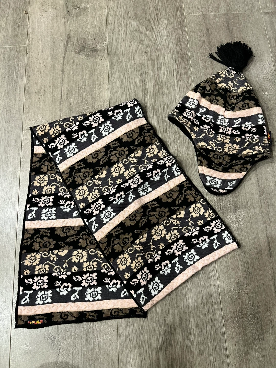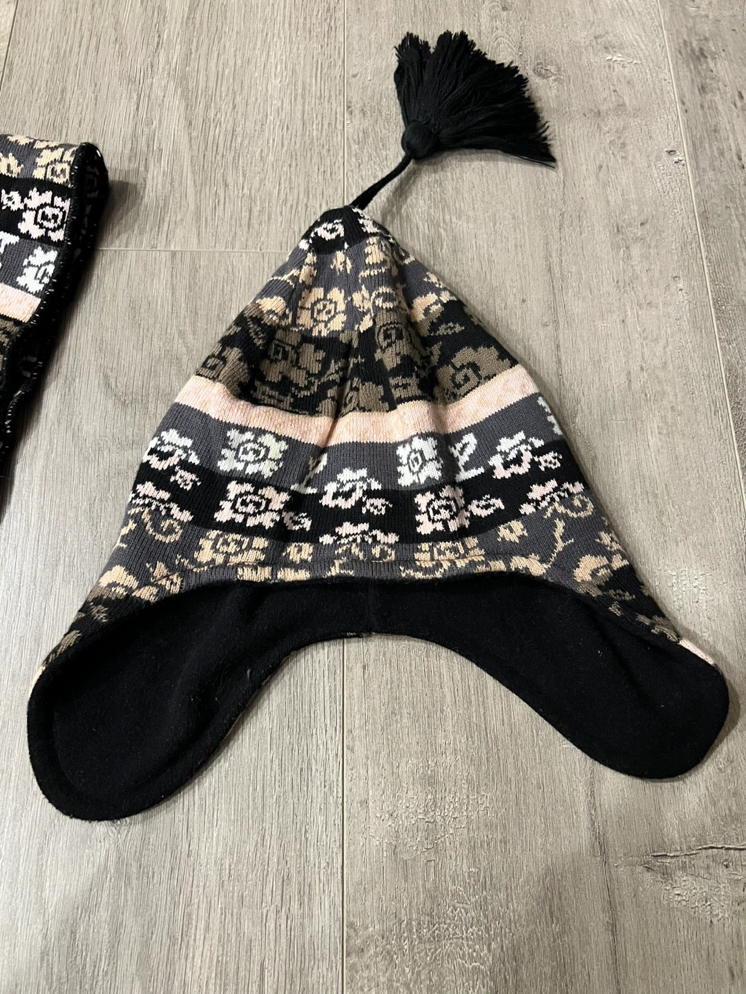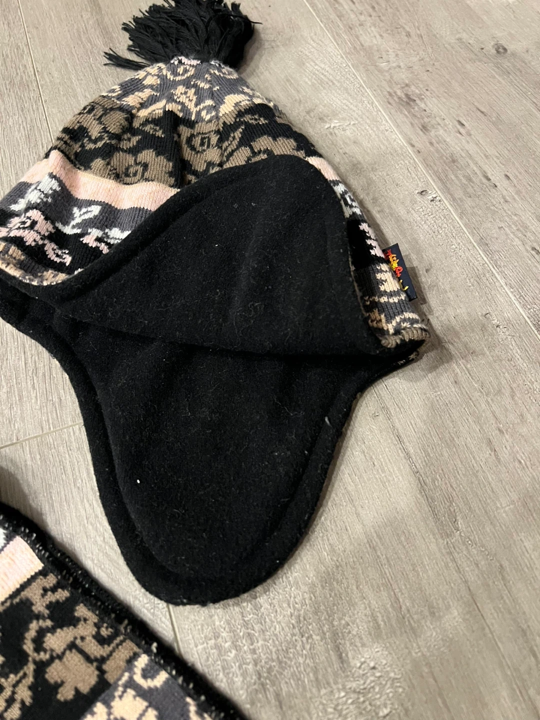 This set includes a Icelandic patterned knitted hat with ear flaps and a matching scarf. The hat's lining is soft fleece for extra warmth. It's a great combo to keep you cozy during colder weather!