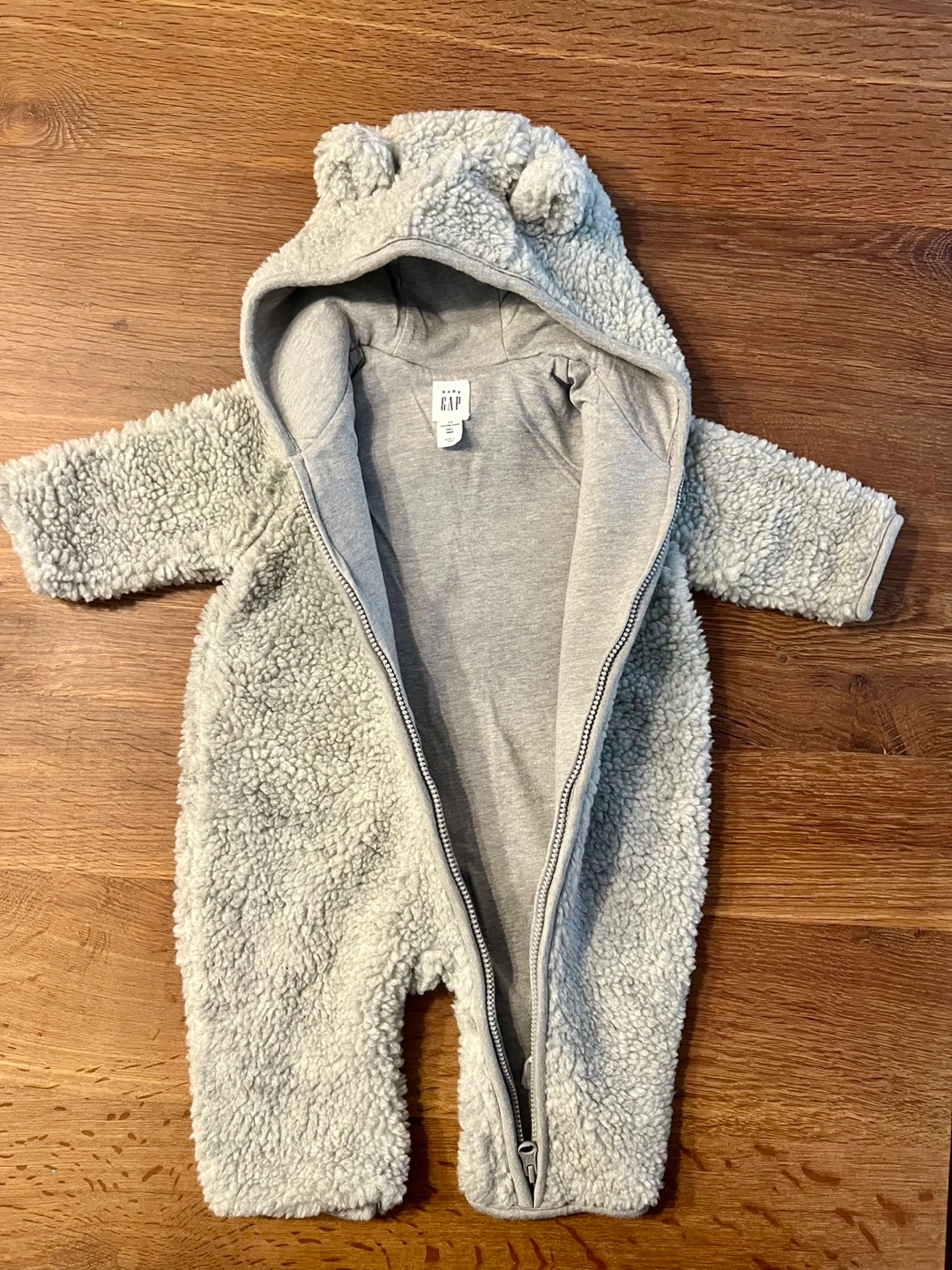 This adorable GAP baby sherpa onesie is perfect for keeping your little one warm and cozy! It features a hood with cute bear ears and a full zip closure for easy dressing. It's in great condition and ready for a new home. Size 0-3 months.