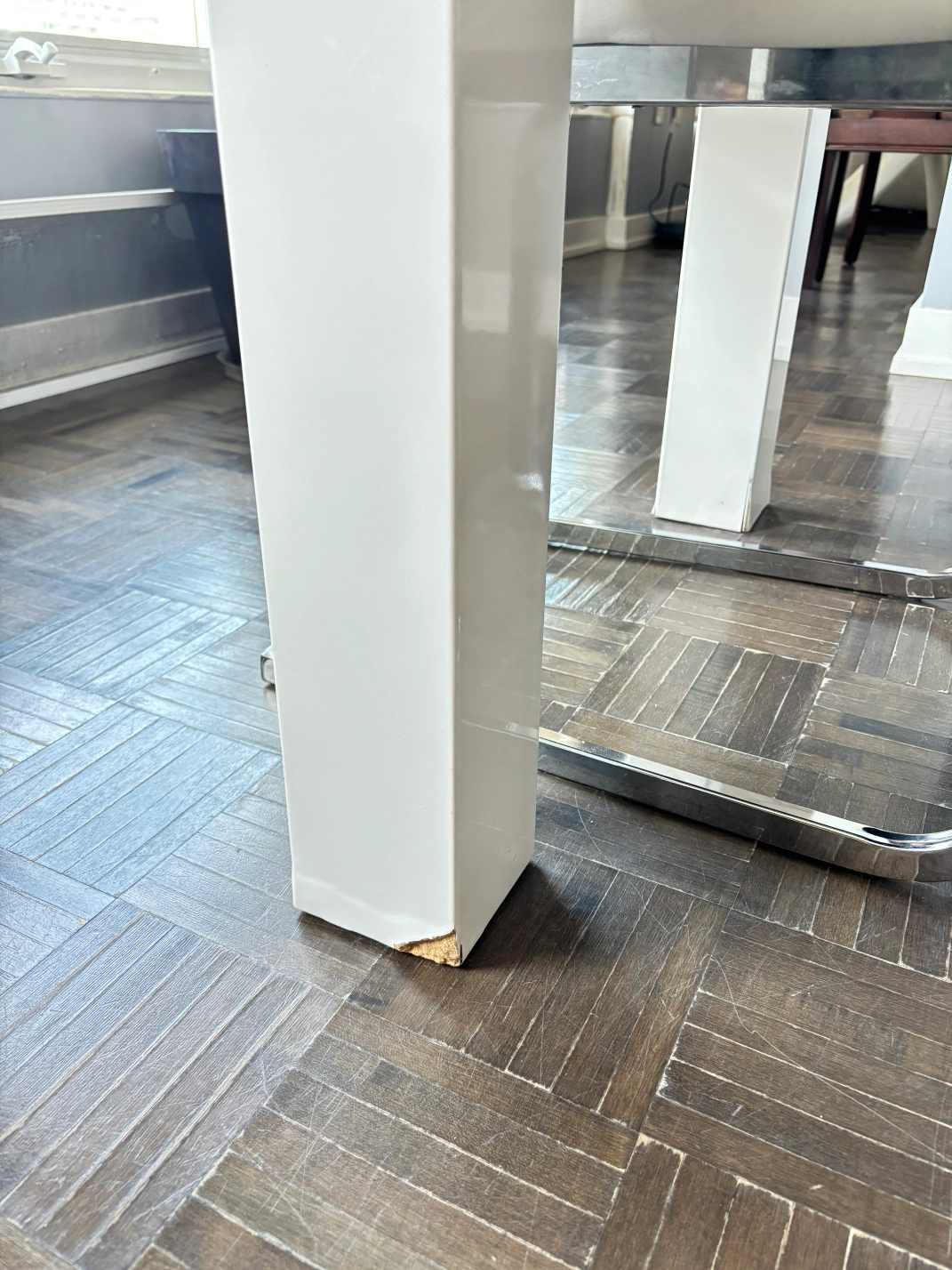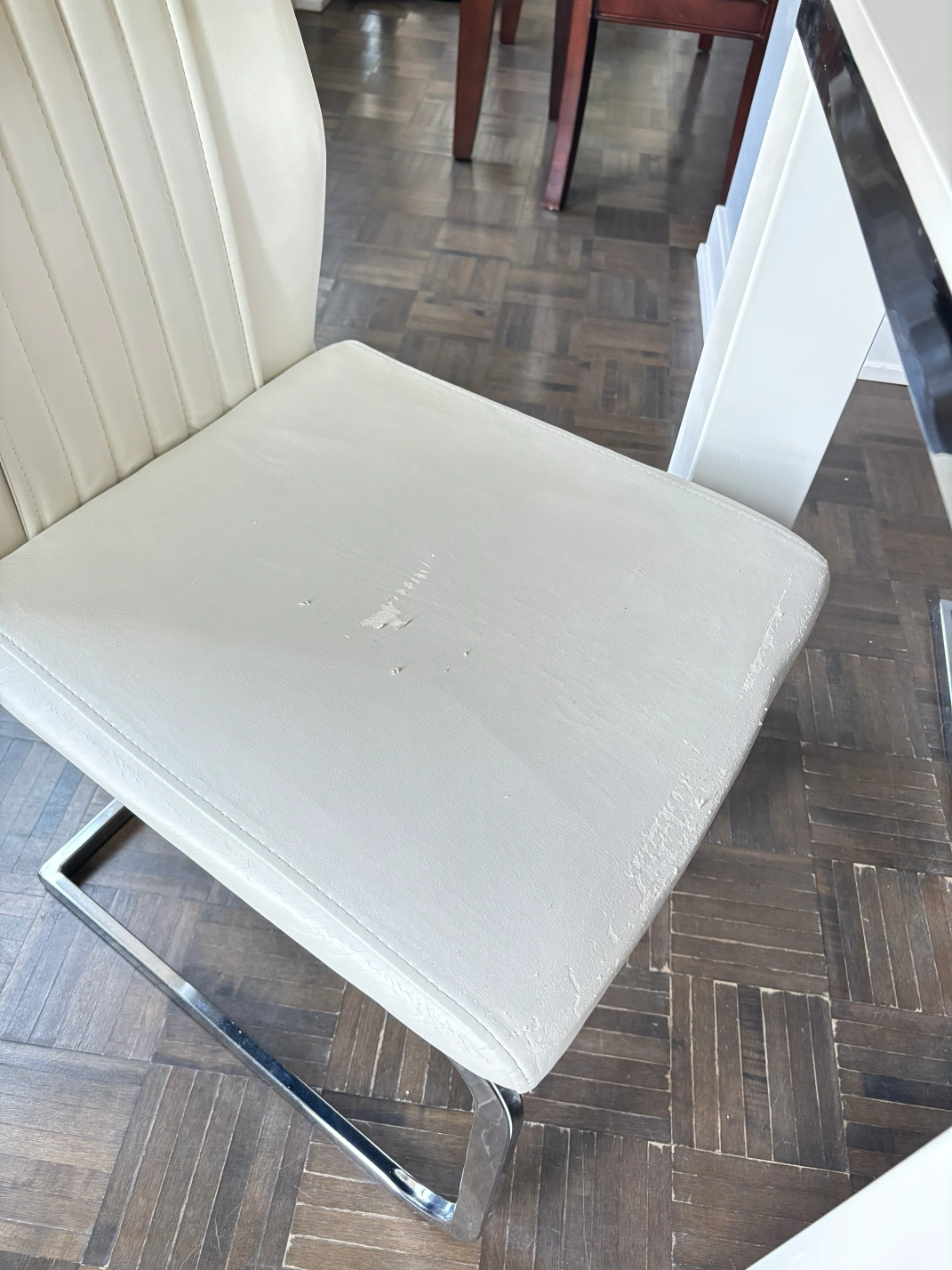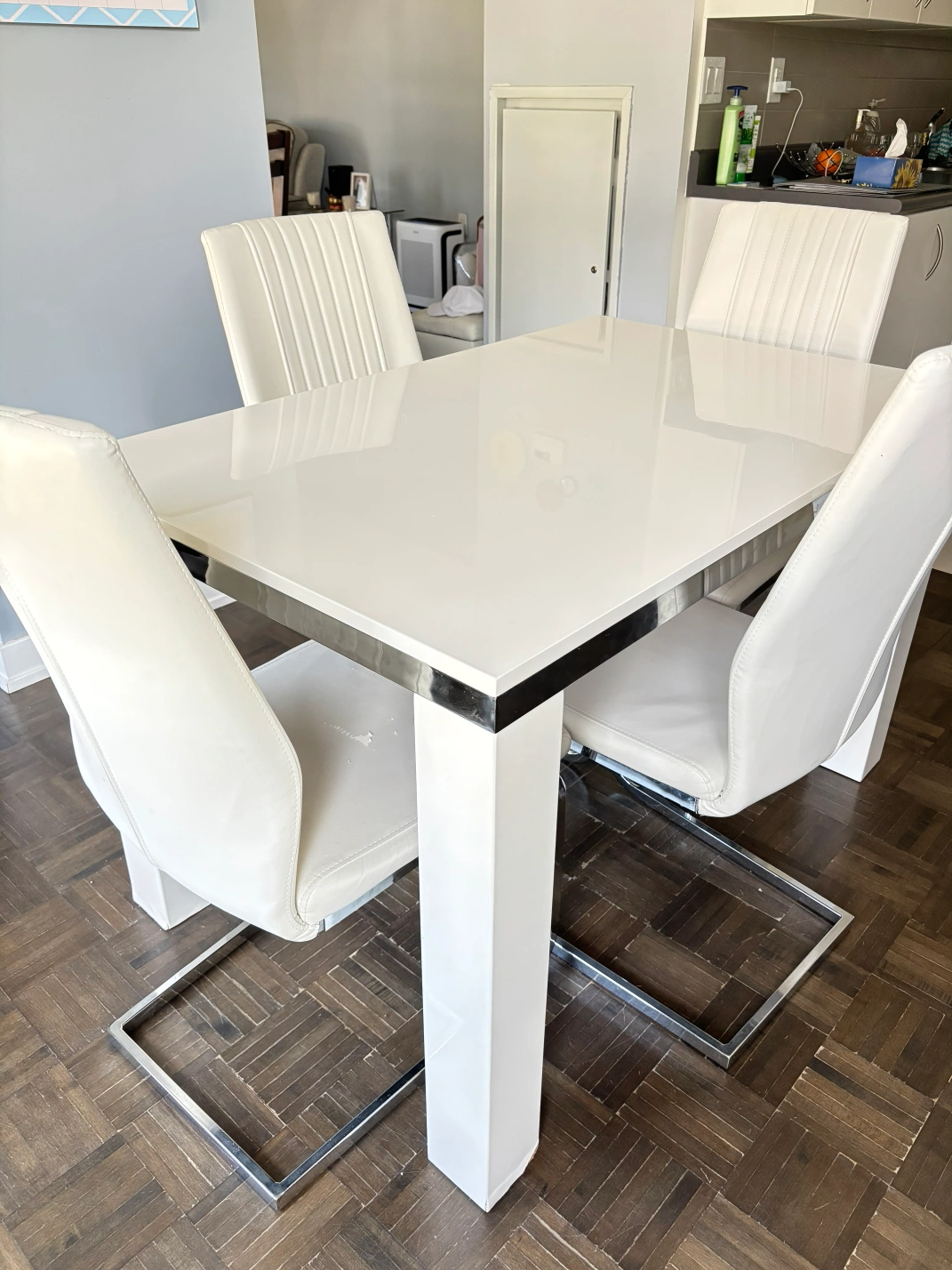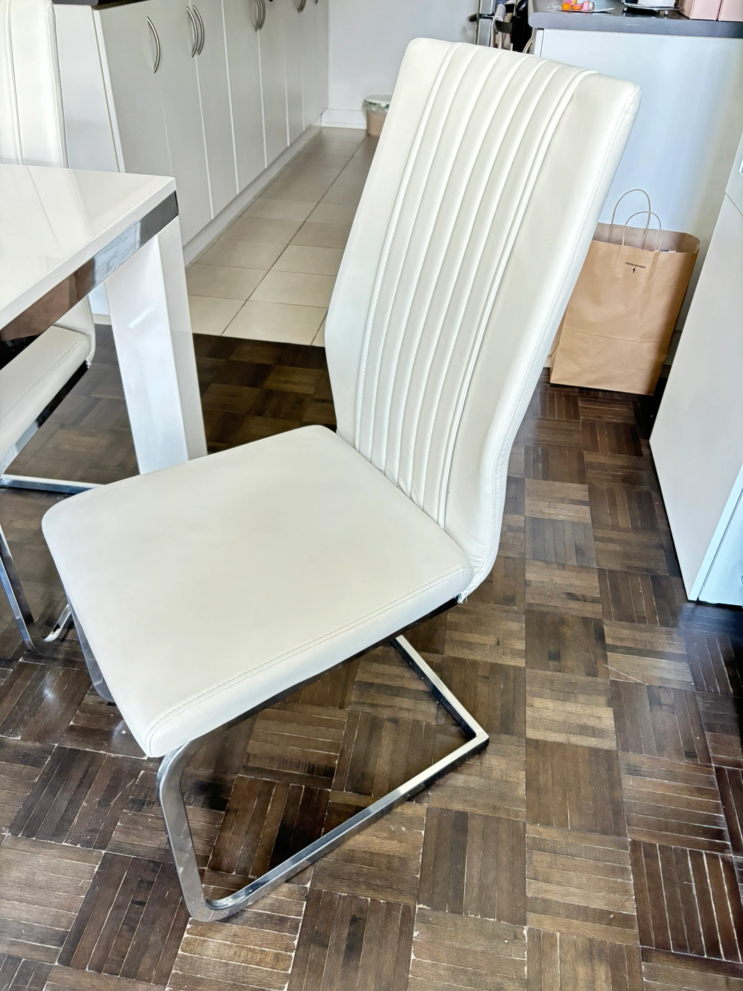 Selling a dining table with four white leather chairs. The chairs are upholstered in white leather with a chrome base. There are some signs of wear on one of the chairs, and the bottom of one of the table legs, as pictured. Pick up only please.